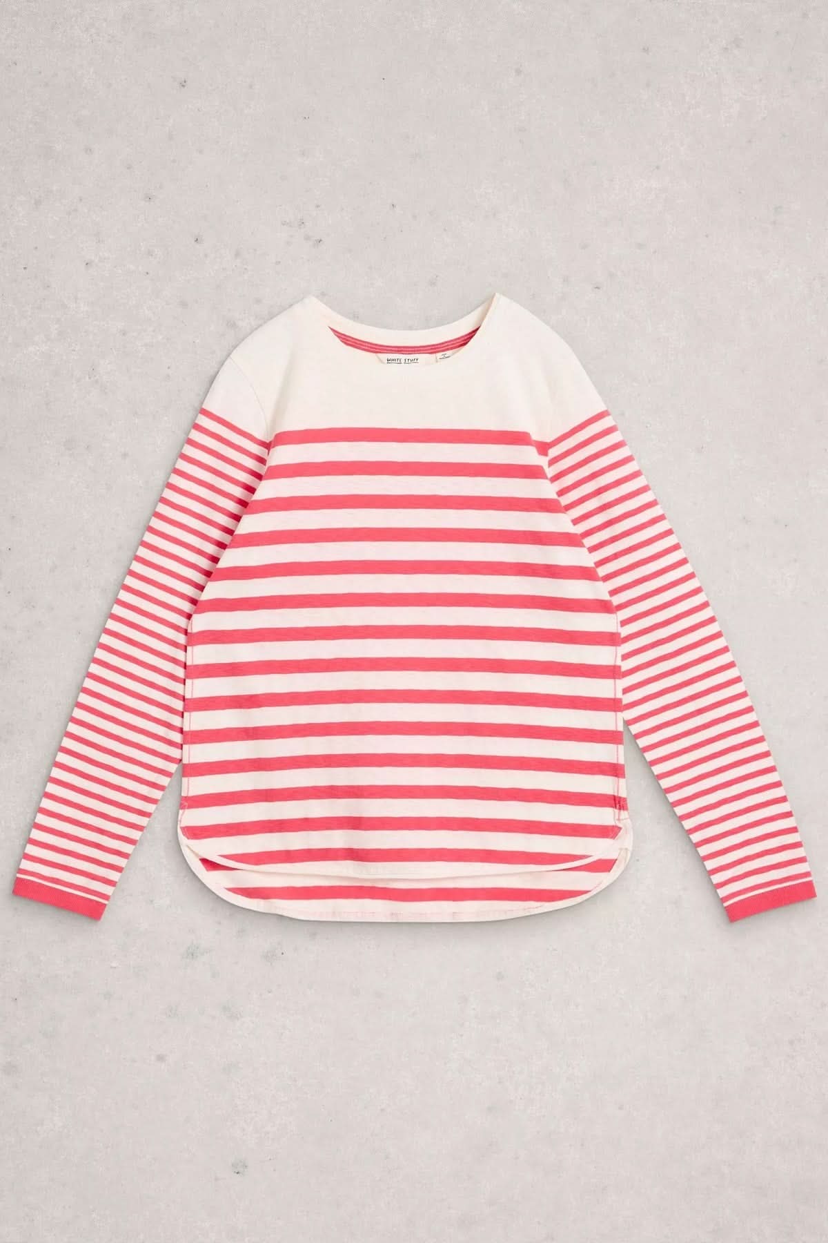 T-shirt rayé à manches longues en tissu doux, coupe droite avec encolure ronde, idéal pour un style décontracté et soigné.