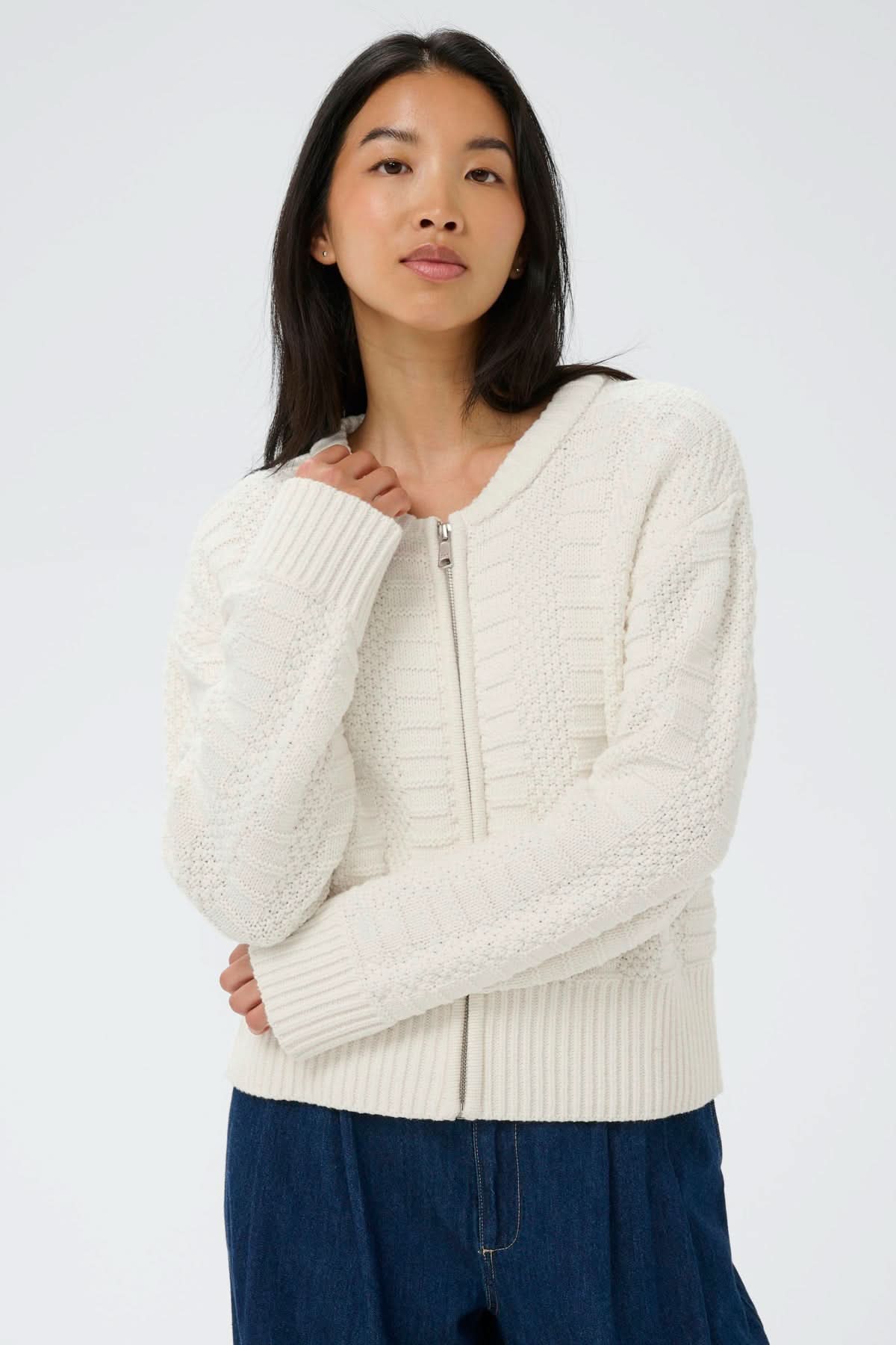 Description : Ce cardigan en maille texturée propose une silhouette épurée et polyvalente, idéale pour superposer avec élégance. Sa fermeture zippée sur le devant apporte une touche moderne tout en facilitant l’enfilage. La maille structurée crée un relief subtil qui rehausse l’ensemble, offrant un équilibre parfait entre confort et style au quotidien.