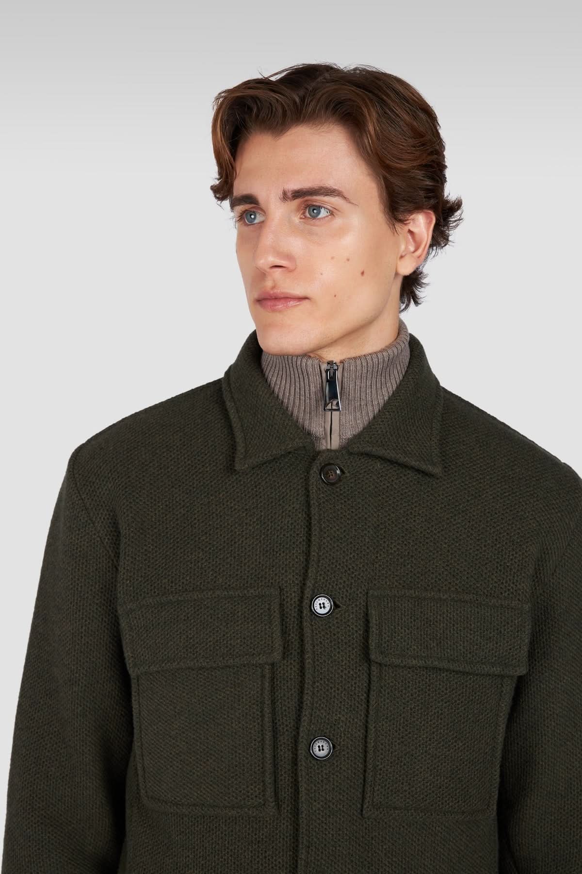 Homme portant une surchemise en laine texturée avec poches plaquées, style moderne et élégant, sur col roulé gris.