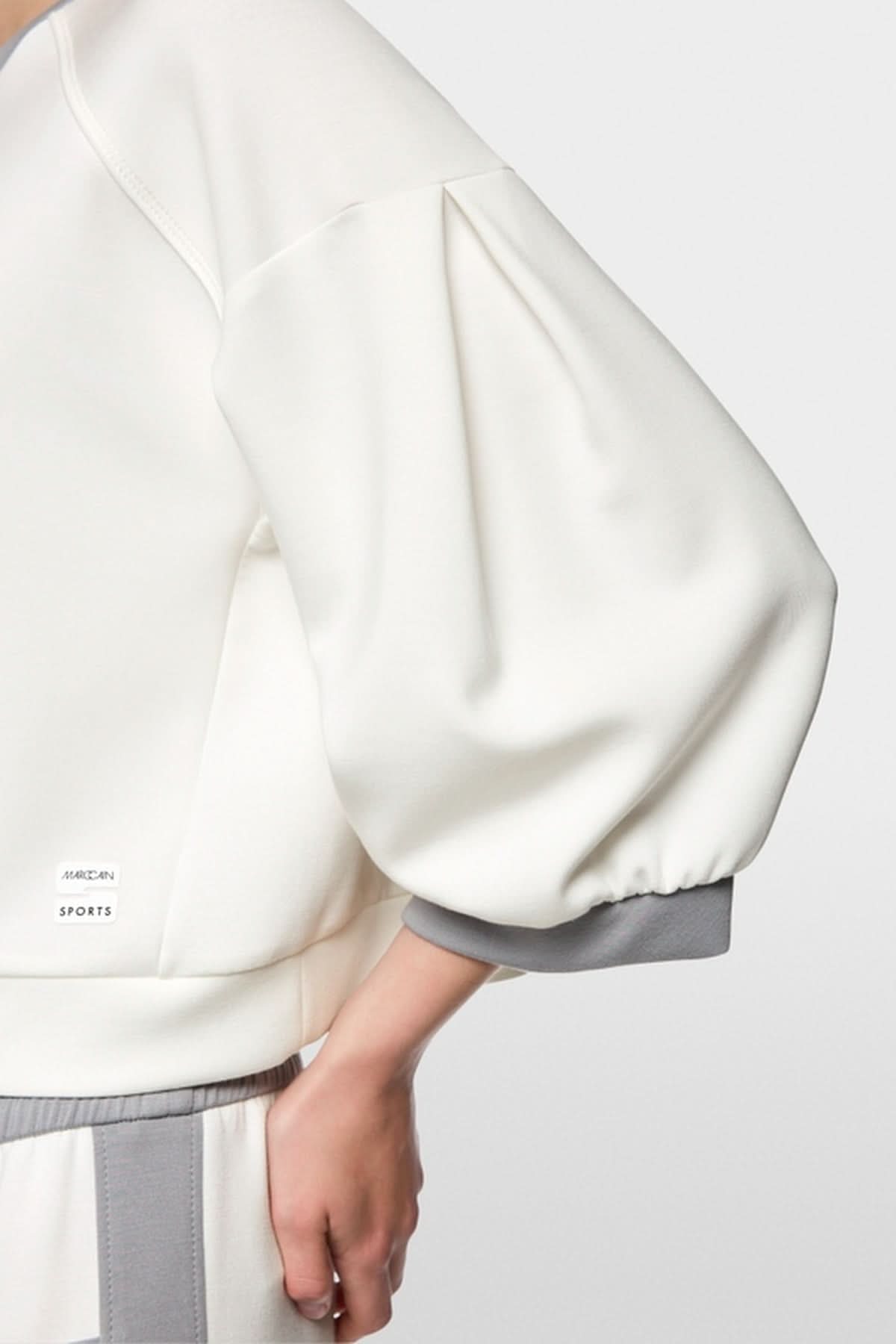 Description : Ce coton ouaté séduit par son mélange de matières ultra-douces, agréables au toucher. Le haut présente une coupe ample et des manches larges, légèrement raccourcies pour une longueur 3/4 décontractée. La coupe carrée et les plis donnent aux manches un aspect bouffant. Les épaules sont tombantes et le coton ouaté est orné de coutures contrastées ainsi que du logo Marc Cain Sports. Le compagnon idéal pour les journées de détente.