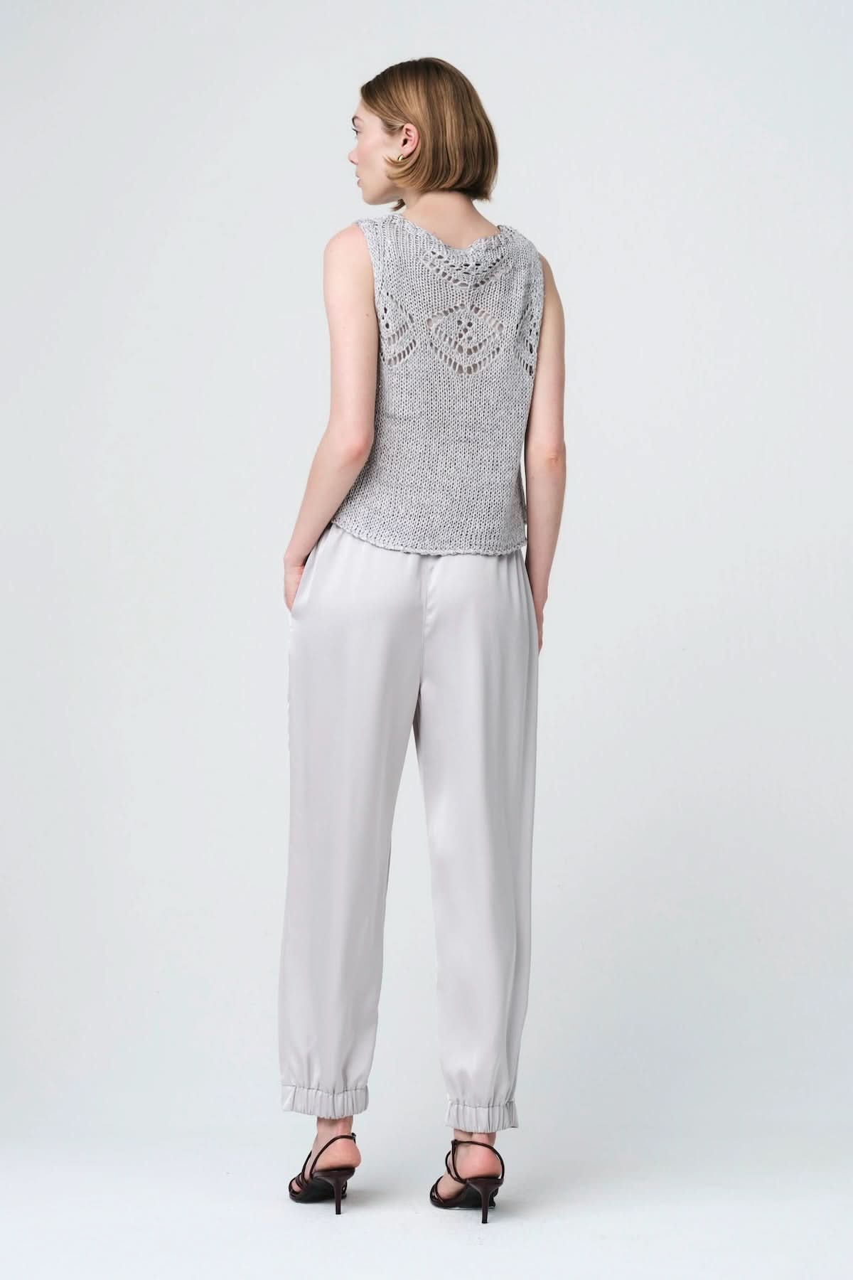 Ce haut en maille séduit par son tricot texturé et son motif ajouré délicat au niveau de la poitrine. Sa coupe droite et sans manches offre une silhouette légère et contemporaine. Facile à superposer ou à porter seul, il apporte une touche raffinée à vos ensembles du quotidien.