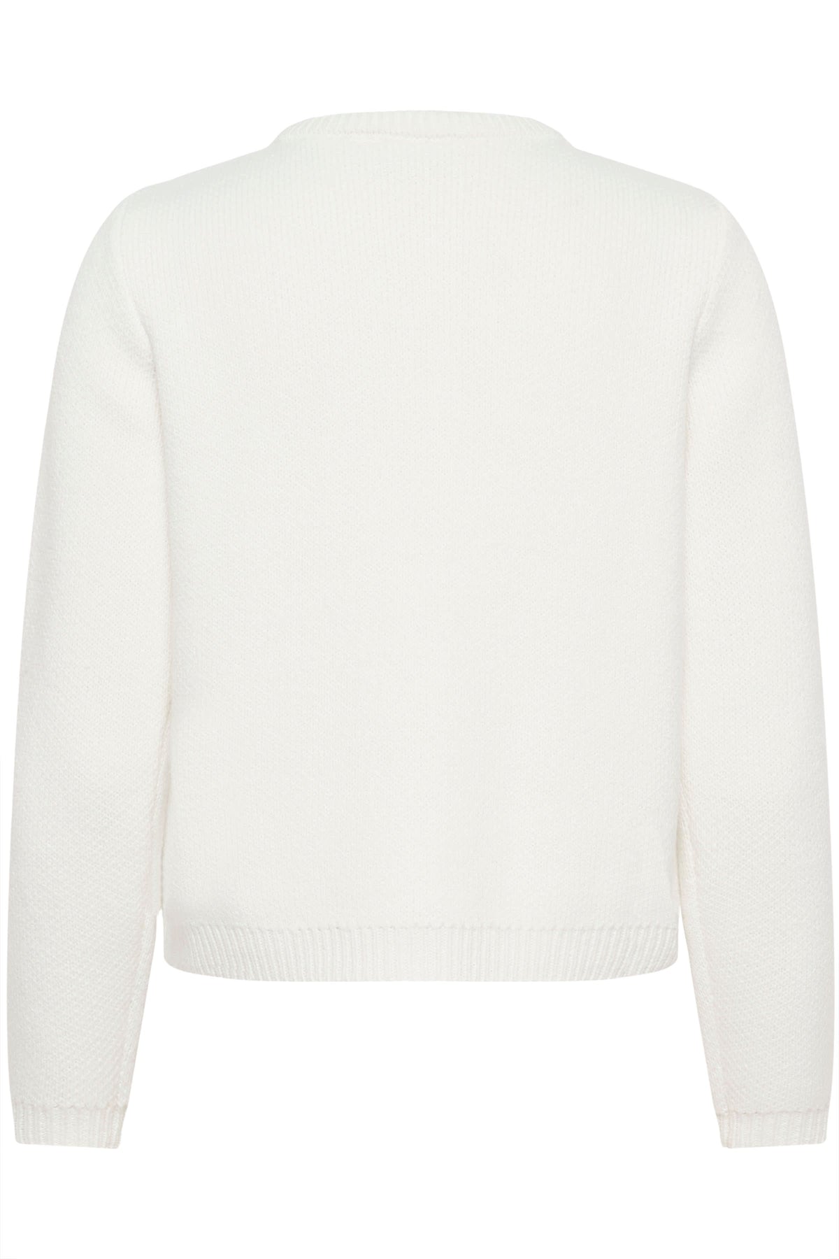 Vue arrière du Cardigan Bowie en maille fine blanche, style délicat et intemporel, détails féminins et coupe droite pour un confort élégant.