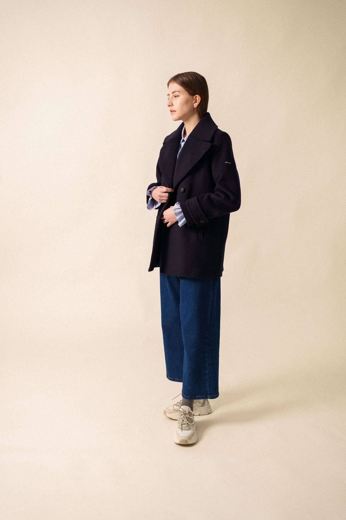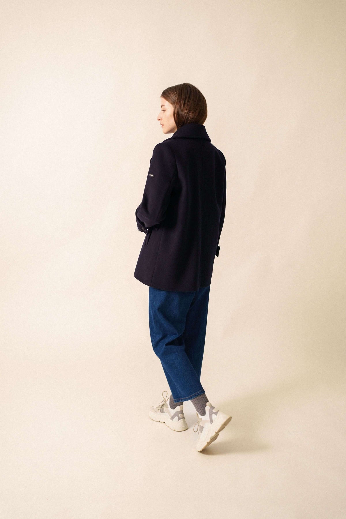 Manteau chic bleu marine avec encolure en V, présenté par une femme dans une tenue décontractée.