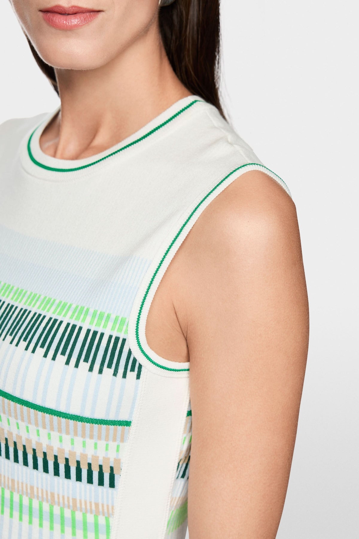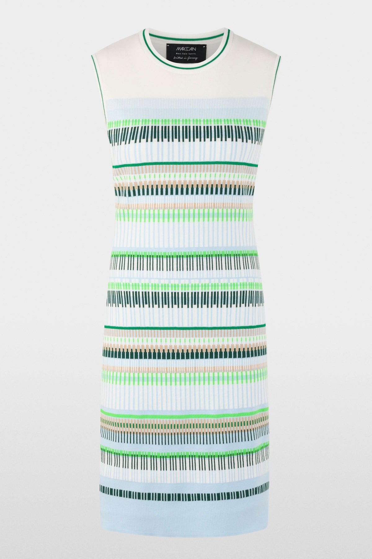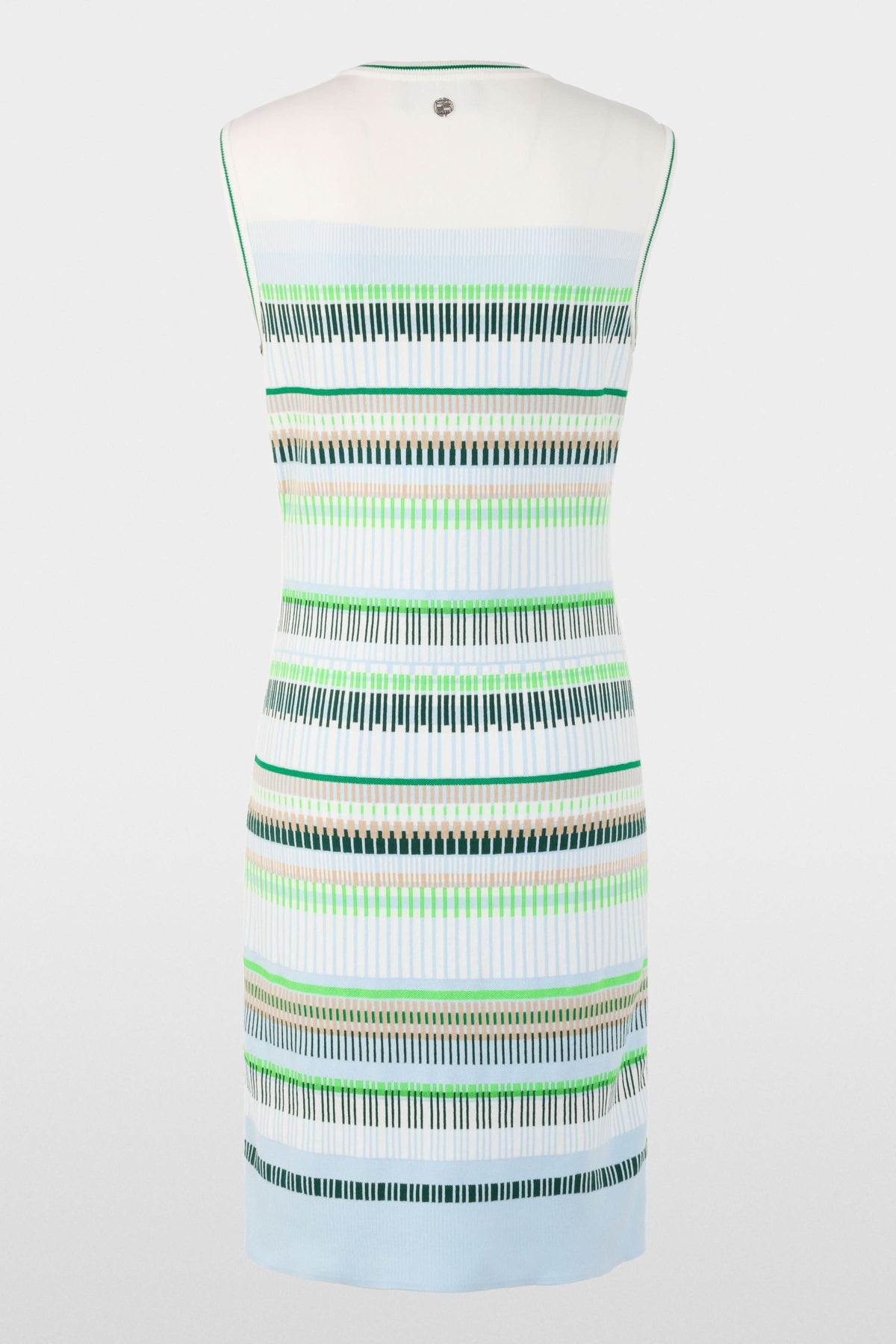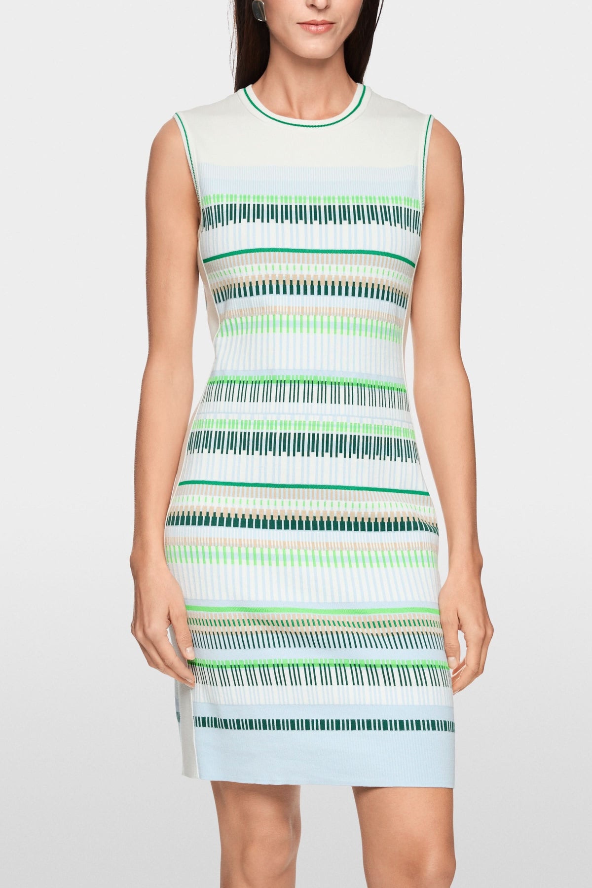Cette robe en maille épouse délicatement la silhouette avec sa coupe ajustée et structurée. Son motif à rayures graphiques apporte du rythme et une touche contemporaine à l’ensemble. Facile à porter au quotidien, elle combine confort et élégance moderne.
