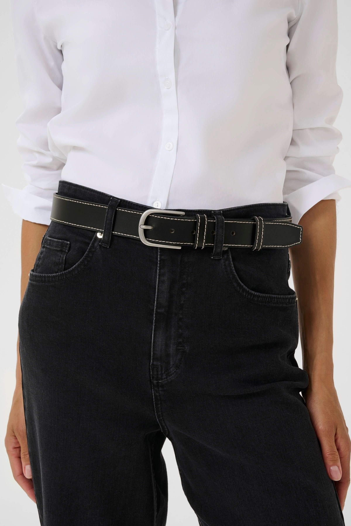 Ceinture Seyra en cuir noir avec surpiqûres contrastantes, portée sur un pantalon noir avec une chemise blanche.