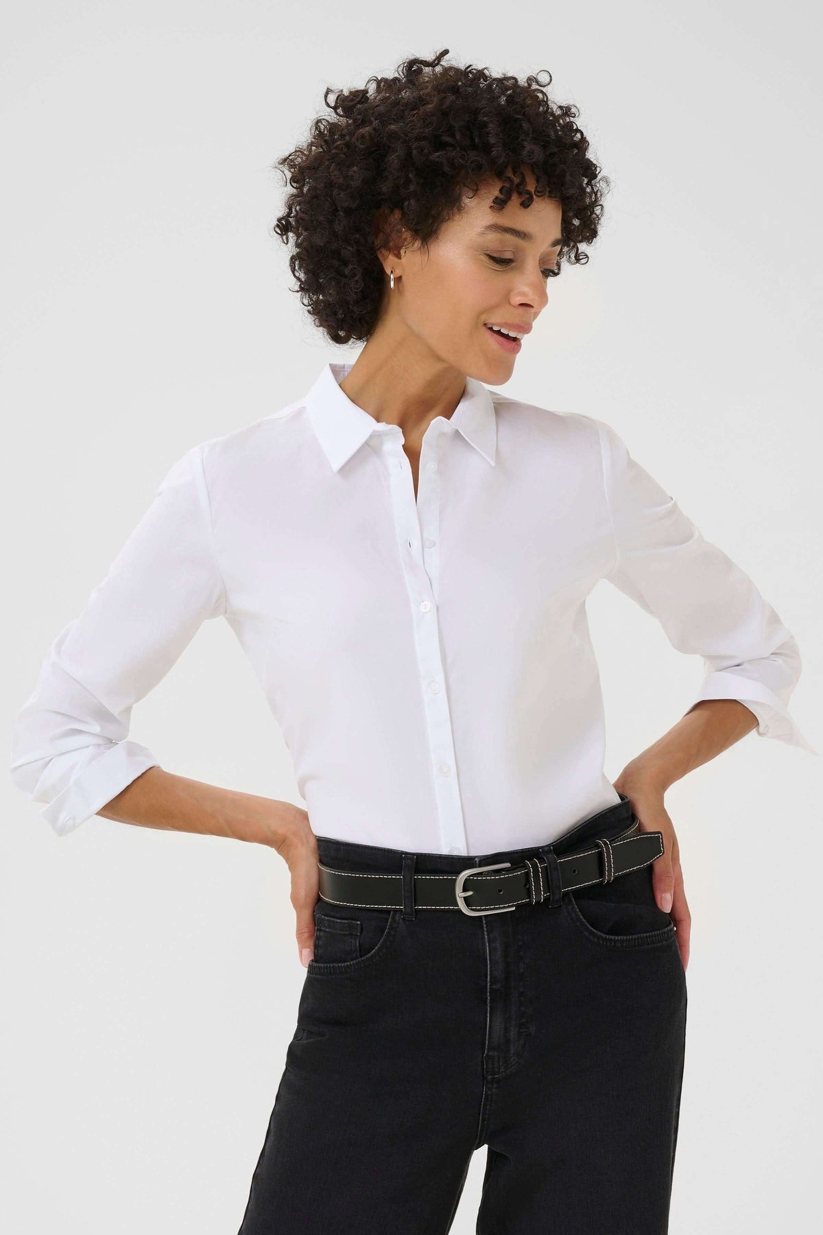 Femme souriante portant une chemise blanche avec une ceinture en cuir noire et un pantalon noir.