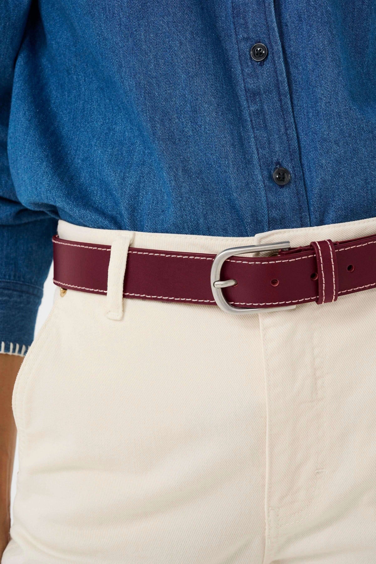 Ceinture en cuir bordeaux avec surpiqûres contrastantes et boucle métallique classique.