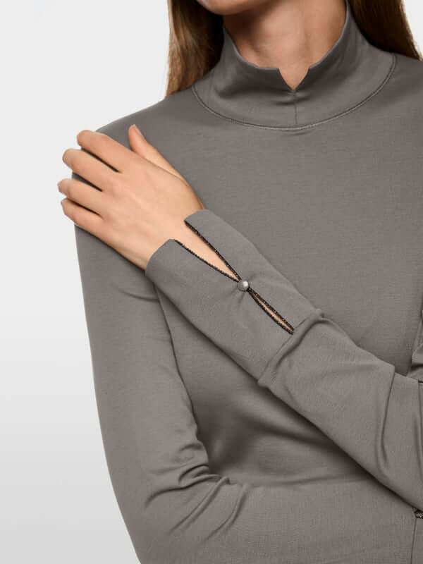 Détail du col roulé ajusté avec zip discret à la manche, mettant en valeur le style moderne et raffiné.