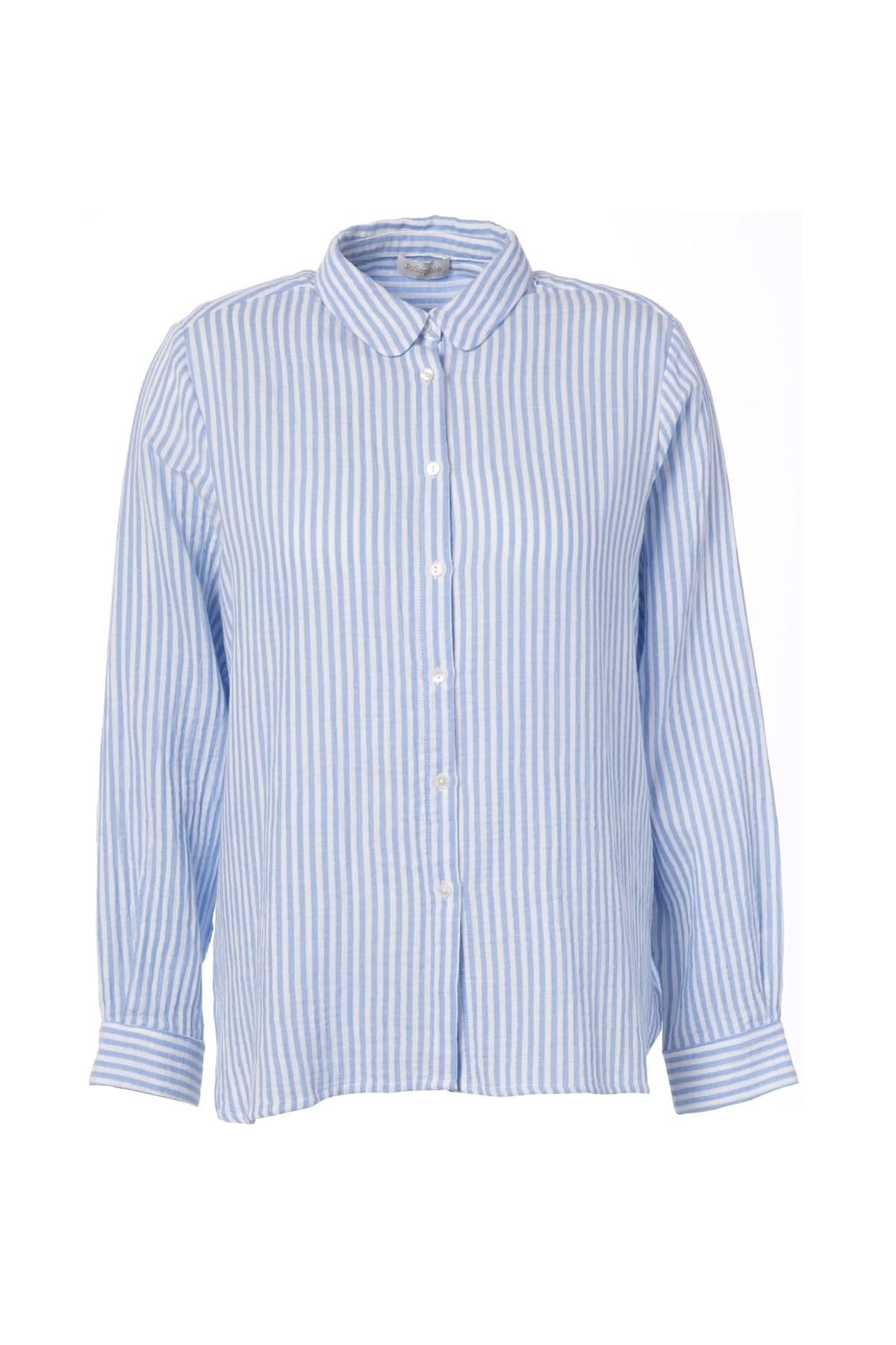 Chemise au charme intemporel revisitée avec une touche de douceur grâce à son col délicatement arrondi. Son motif rayé vertical allonge la silhouette, tandis que sa coupe droite assure une allure à la fois classique et décontractée. Confectionnée dans une matière légère et texturée, elle se porte aussi bien rentrée dans un pantalon taille haute que laissée fluide pour un style plus casual.
