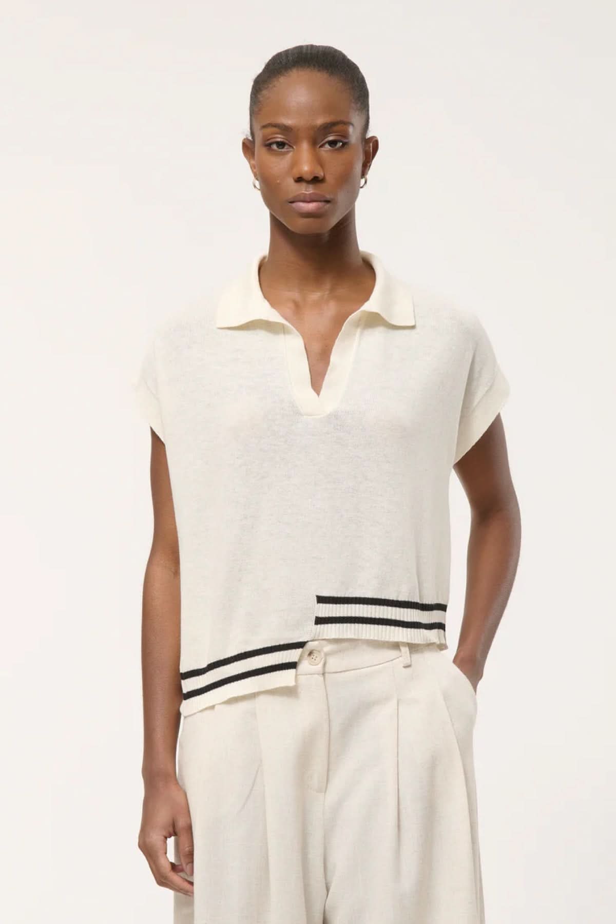 Ce haut en tricot léger propose une silhouette moderne et décontractée. Son col polo ouvert apporte une touche structurée, tandis que sa coupe légèrement ample assure un tombé fluide et confortable. Les fines rayures contrastantes à l’ourlet ajoutent un détail graphique subtil qui dynamise la pièce. Facile à porter avec un pantalon ample ou plus ajusté, il s’intègre parfaitement à une garde-robe minimaliste et raffinée.