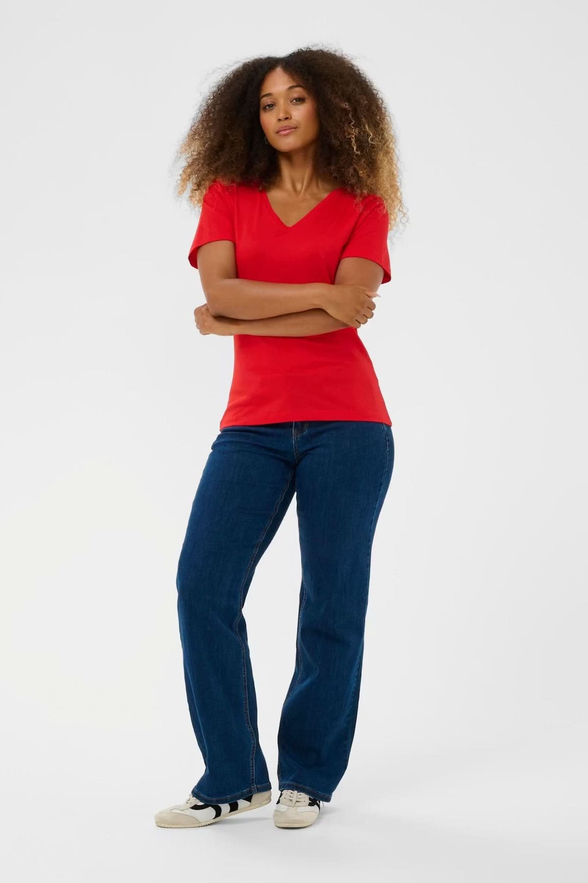 Un indispensable du quotidien revisité dans une coupe flatteuse et confortable. Ce t-shirt à col en V offre une silhouette épurée qui met en valeur le port de tête tout en restant facile à porter. Sa matière douce et extensible épouse délicatement les formes sans les contraindre, pour un confort optimal du matin au soir. Parfait seul avec un jean ou superposé sous un veston léger, il s’intègre naturellement à toute garde-robe.