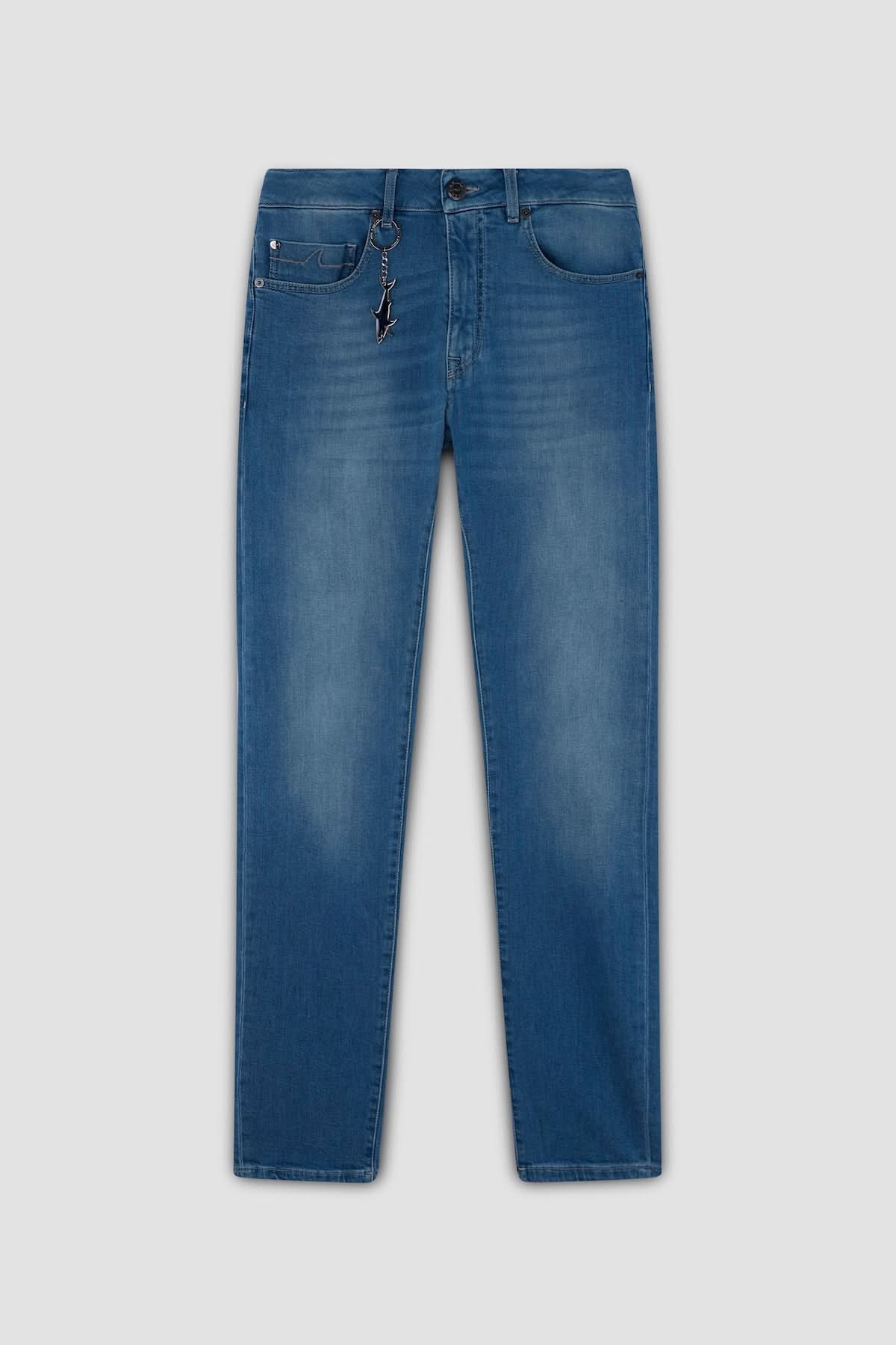 Ce jean propose une silhouette intemporelle rehaussée de détails signature. Sa coupe droite assure un confort naturel et un style polyvalent qui s’adapte facilement aux looks décontractés comme plus habillés. Le tissu légèrement délavé crée un effet authentique et moderne, complété par un pendentif métallique en forme de requin attaché à une boucle de ceinture.