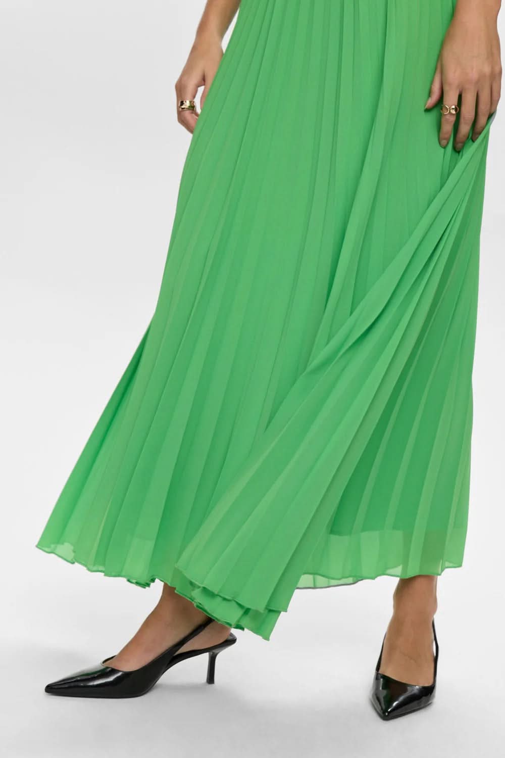 Jupe longue plissée à fines bretelles en tissu léger vert, offrant une silhouette élégante et fluide avec détails de plis raffinés.