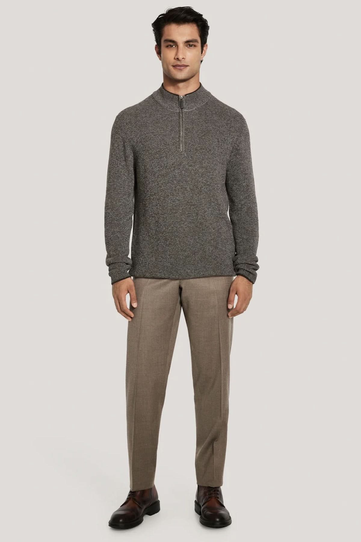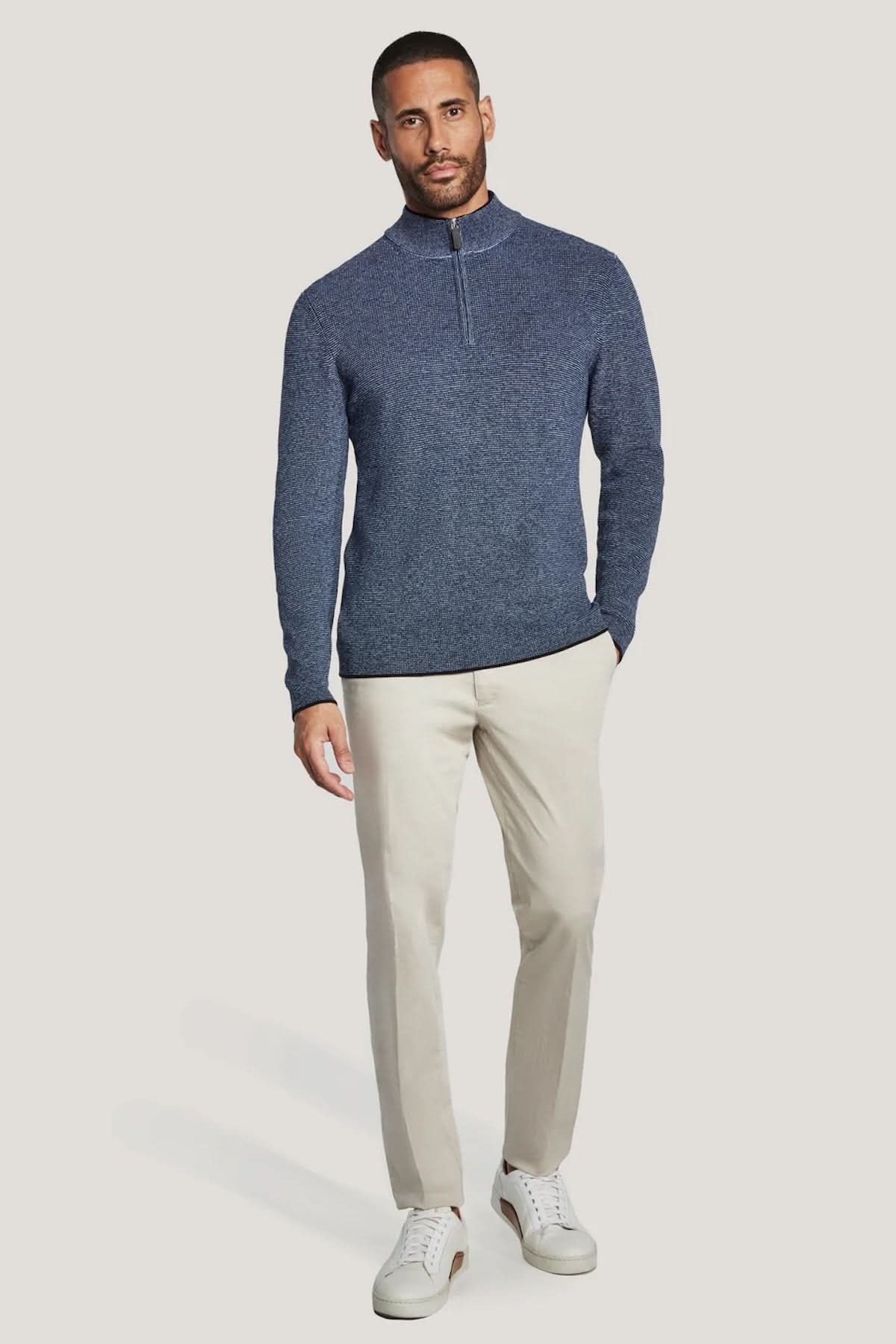 Description: Ce pull à col montant zippé est confectionné en coton de qualité, offrant un tricot texturé de calibre 12 au toucher doux. Sa coupe moderne et épurée en fait une pièce polyvalente, idéale en superposition sous un blazer ou portée seule avec un pantalon. Un essentiel de mi-saison qui allie confort et sophistication.