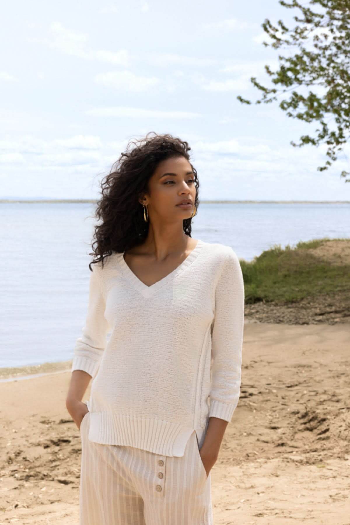 Description : Ce chandail à la coupe épurée séduit par son tricot délicat et sa silhouette naturellement flatteuse. Son col en V met le décolleté en valeur avec subtilité, tandis que la maille fine apporte une sensation de légèreté et de confort. Idéal pour la belle saison comme pour les superpositions, il s’intègre facilement à une garde-robe polyvalente.