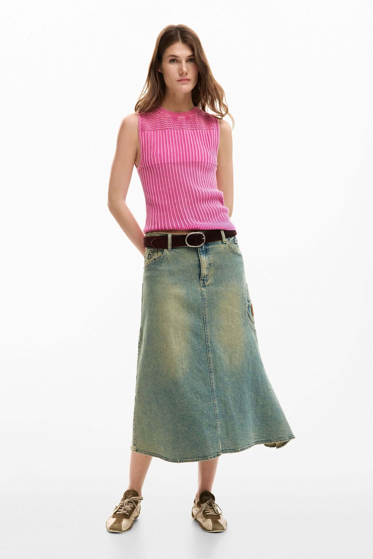 Camisole crochet rose ajustée, sans manches, en maille texturée avec finitions côtelées, pour un look moderne et estival.
