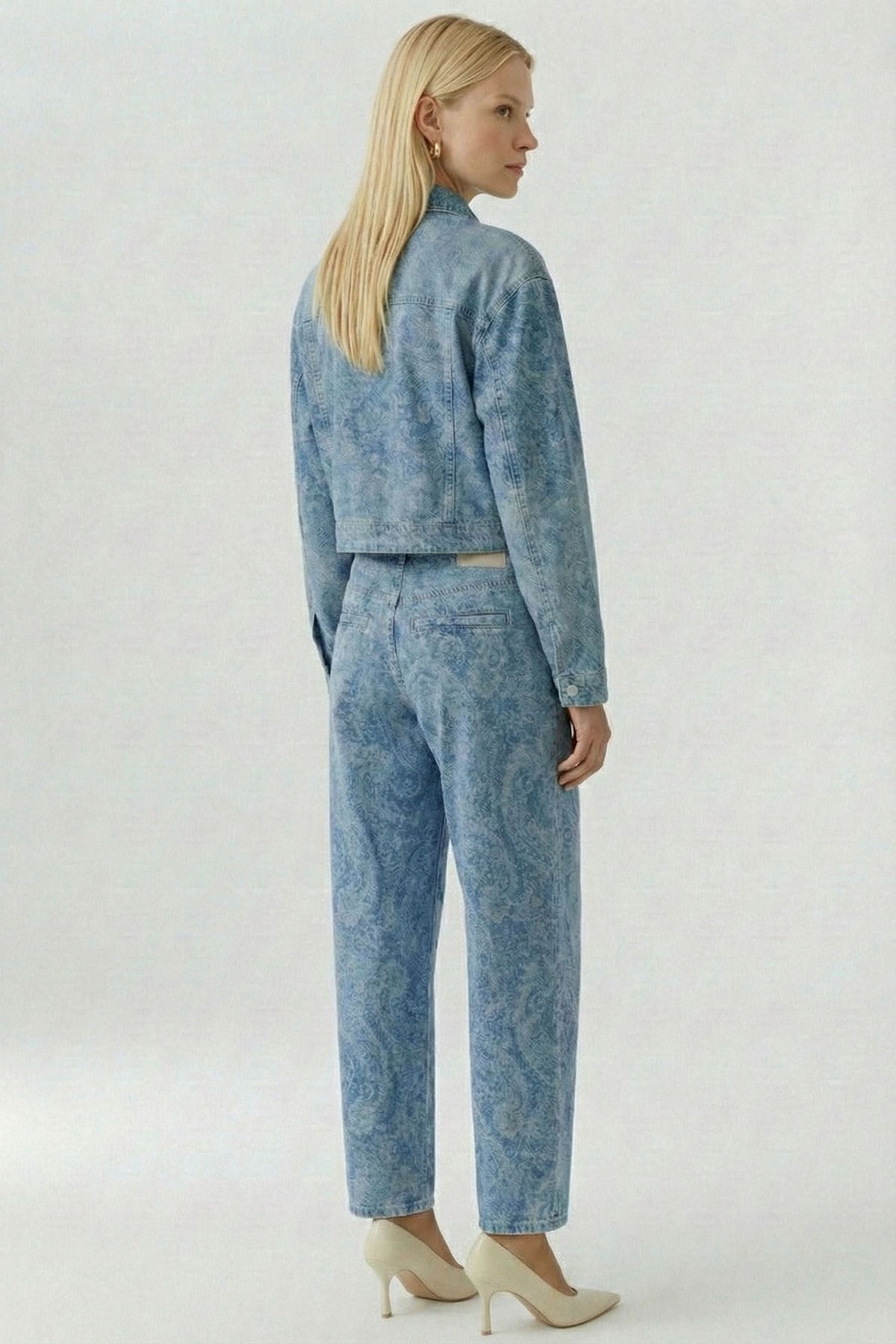 Modèle portant une veste en jean imprimée avec un motif cachemire, coupe courte et structurée, associé à un pantalon coordonné.