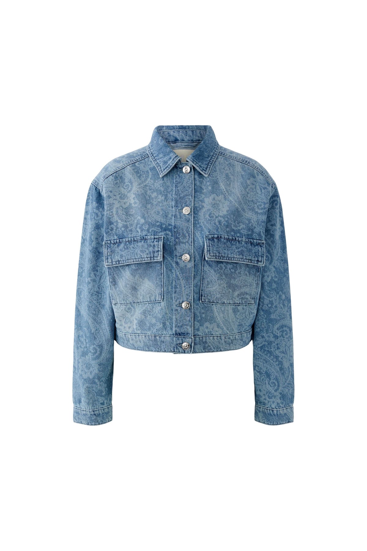 Veste en jean imprimée, motif cachemire subtil, coupe raccourcie, esprit utilitaire, idéale pour une allure moderne et élégante.