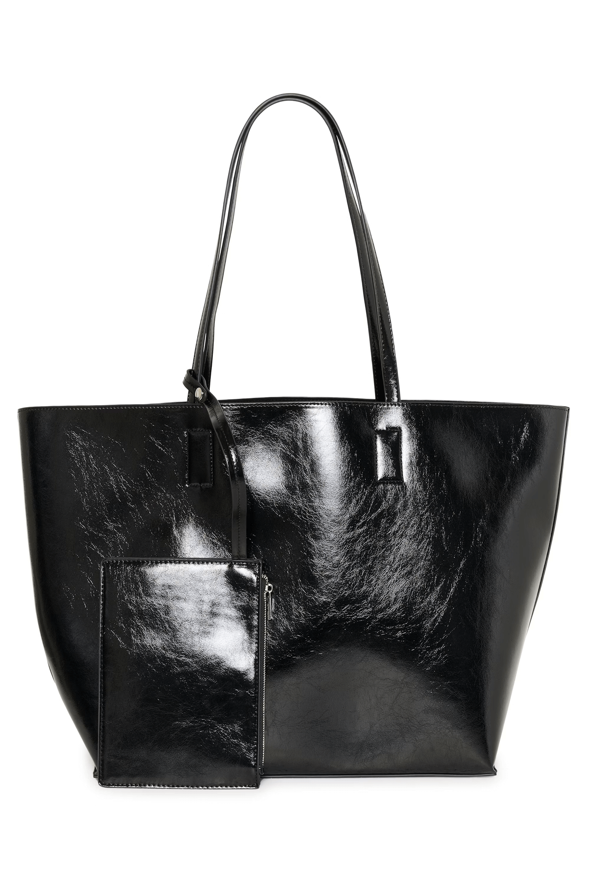 Description: This large tote bag with a glossy finish appeals with its sleek design and practicality. Its long handles allow for comfortable shoulder carrying, while its matching removable pouch adds a functional touch. Style tip: Pair it with your work outfits or casual looks for a chic and versatile accessory.