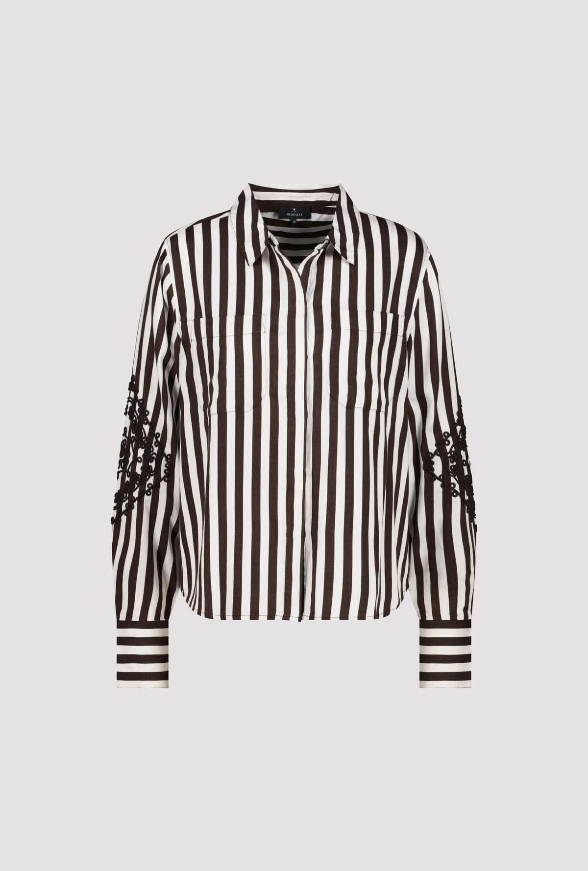 Description: This blouse makes a bold graphic statement with its vertical stripe pattern, while maintaining a refined look. Delicate embroidery on the sleeves adds an elegant contrast and a couture detail that sets this piece apart. Its flowing fabric ensures a comfortable fit, ideal for both the office and a more casual, polished outfit.