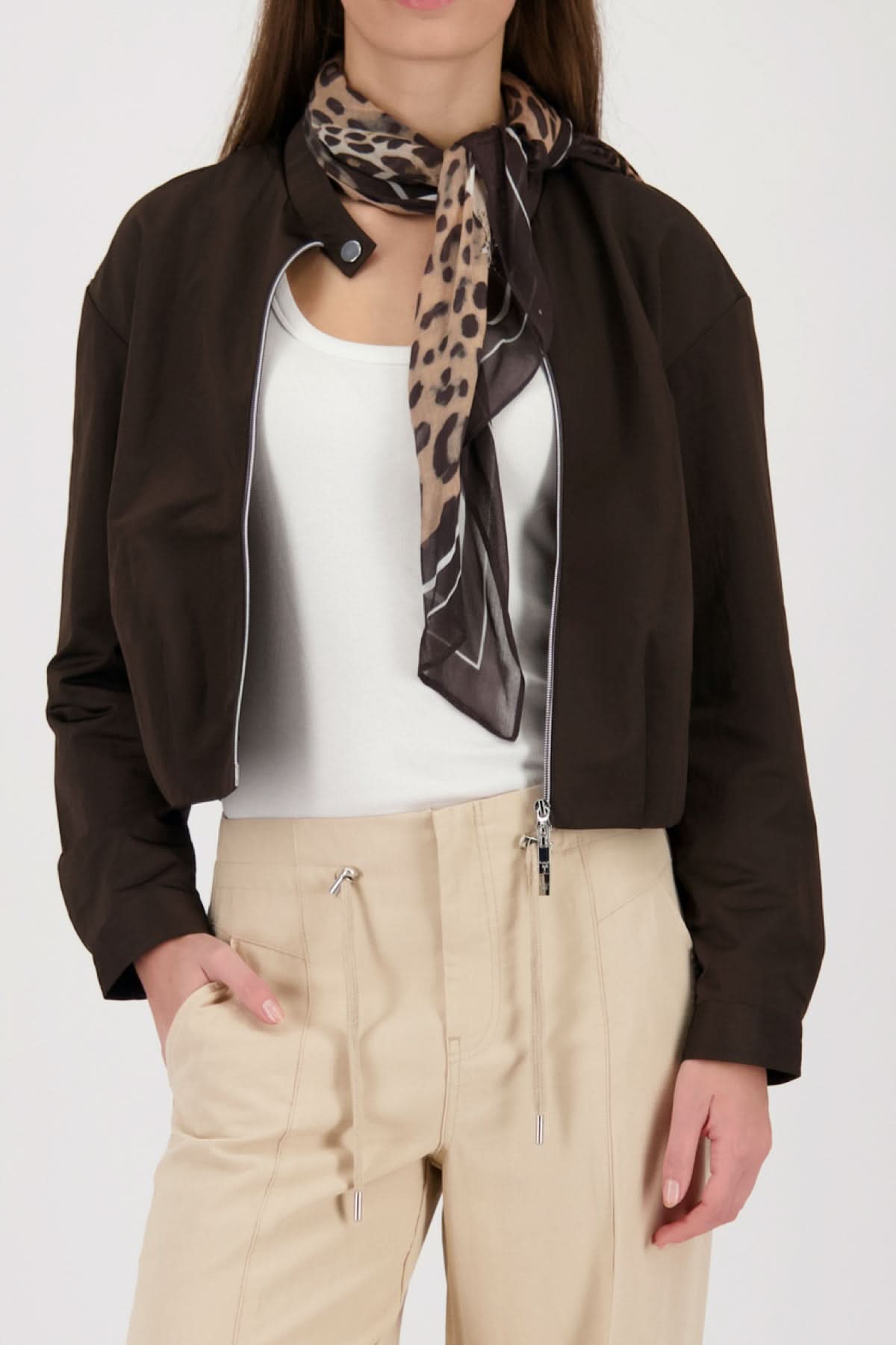 Foulard imprimé léopard artistique noué autour du cou, ajoutant sophistication et caractère à la tenue élégante.