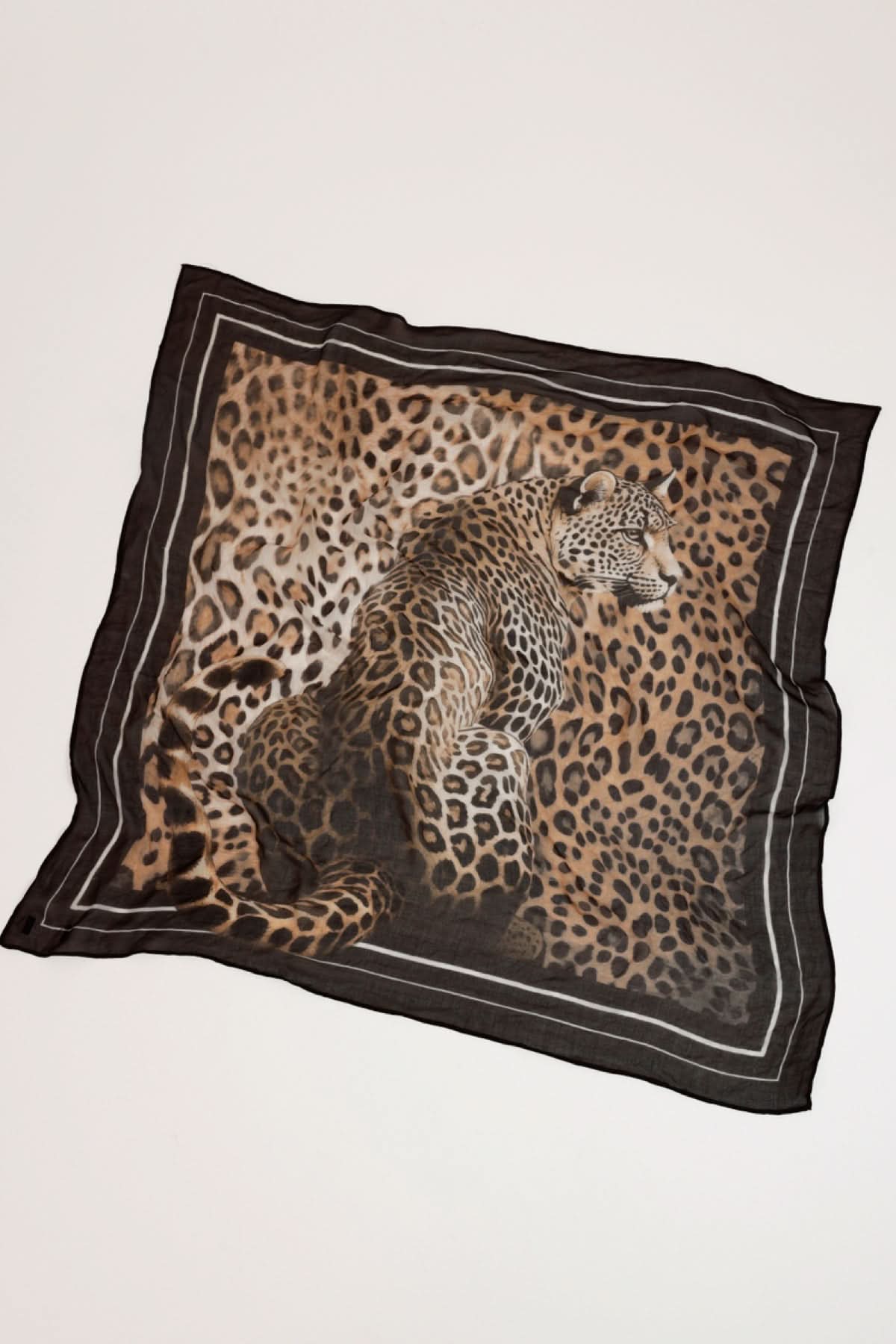 Description: This square scarf stands out with its striking illustration of a majestic feline, enhanced by a tone-on-tone leopard print pattern. The rich, enveloping visual effect adds depth and character to the piece. Worn around the neck, on the shoulders, or tied to a bag, it adds a bold and sophisticated touch to any outfit.