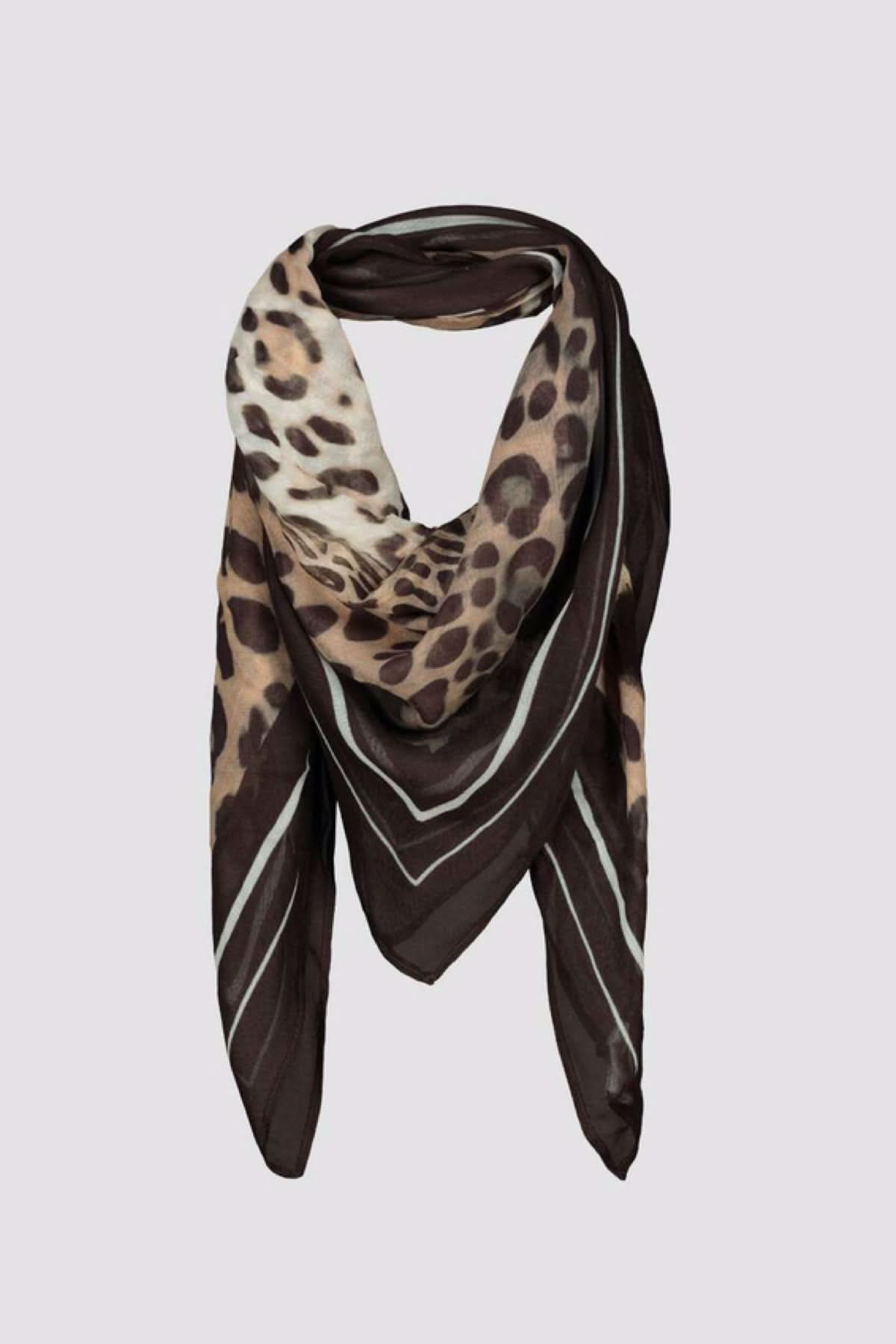 Foulard imprimé léopard artistique porté avec une tenue neutre, ajoutant sophistication et caractère à l'ensemble élégant.