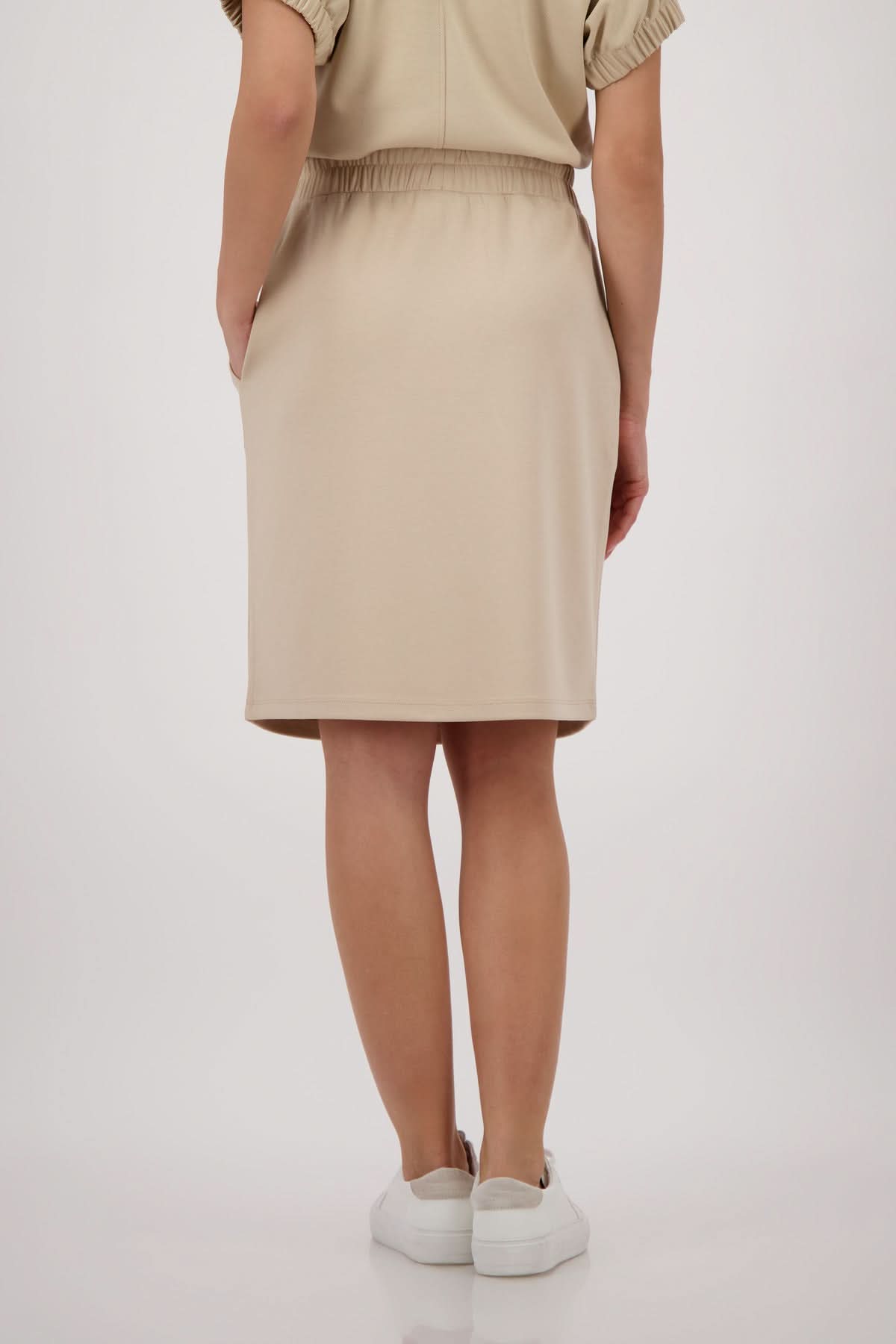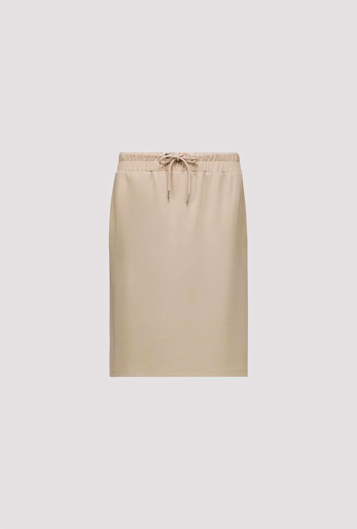 Description: This straight skirt has a sleek, contemporary look, ideal for creating versatile everyday outfits. Its elastic waistband with adjustable drawstring ensures optimal comfort while adding a casual, modern touch. Easy to coordinate, it can be worn with either a fitted top or a looser knit.