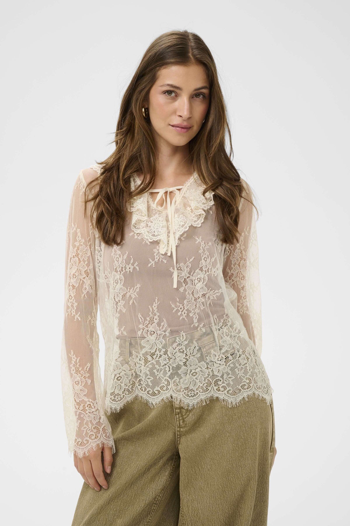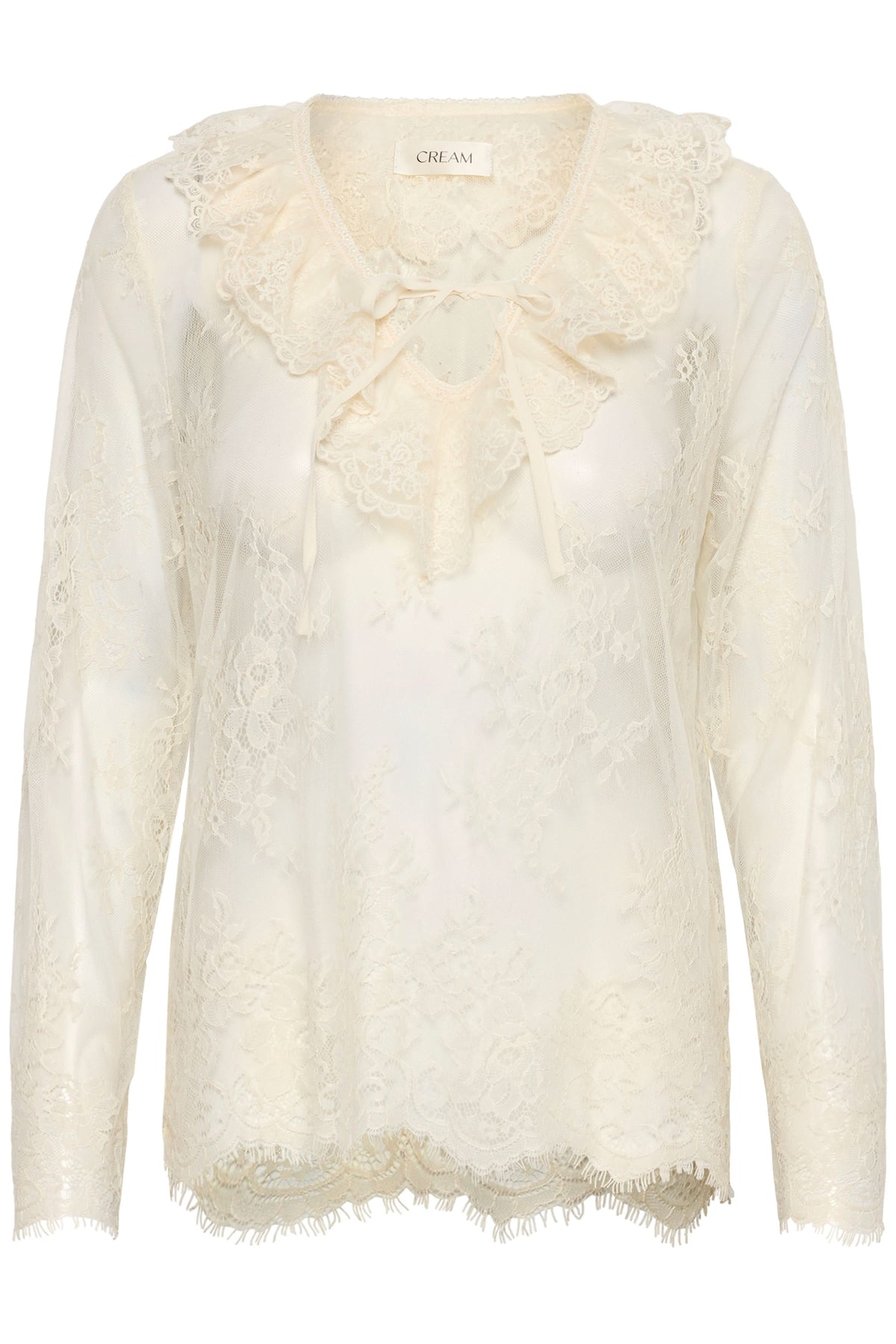This blouse offers a romantic and delicate silhouette, ideal for creating elegant layers. Its fine, sheer lace adds lightness and refinement to the overall look. The lace-trimmed collar and tie at the neckline add a feminine and sophisticated touch.