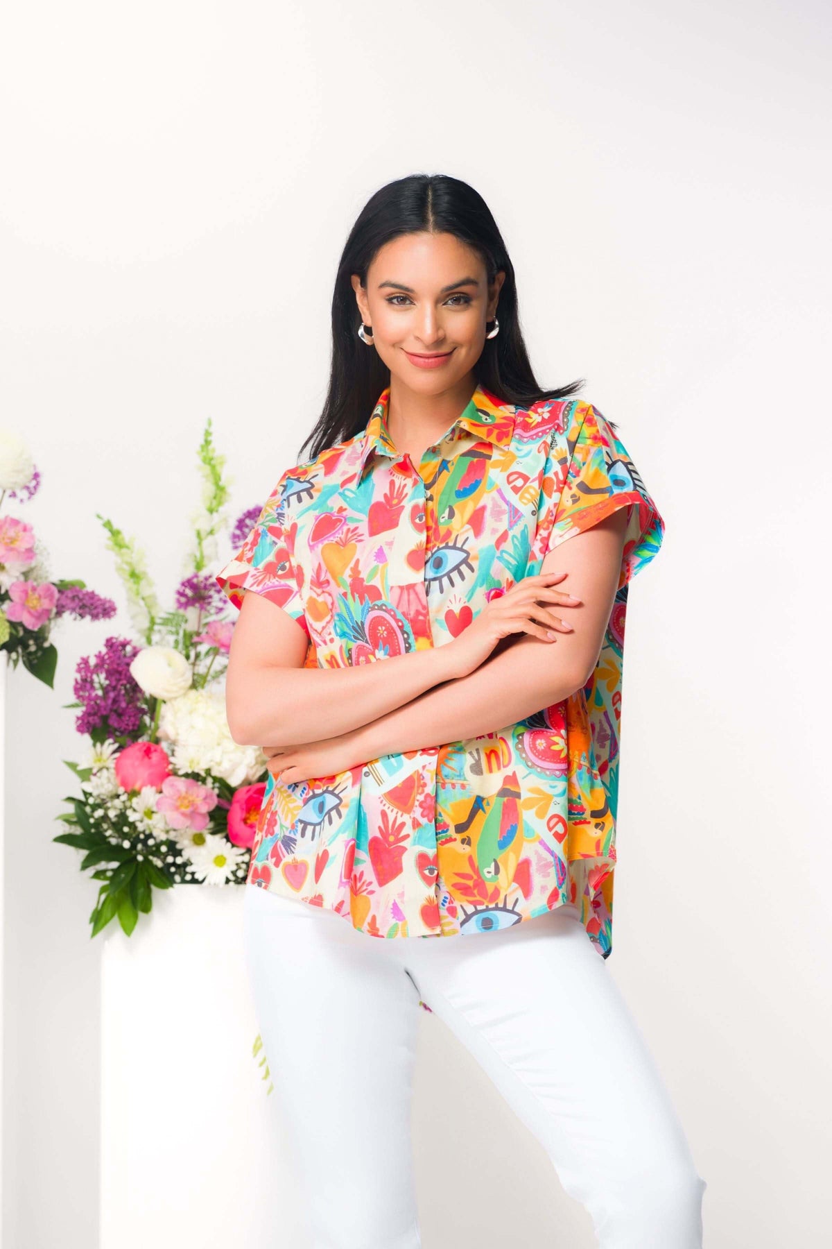 This short-sleeved blouse stands out with its expressive print and resolutely modern look. Its flowing Fit fabric offers a light and comfortable fit, while the shirt collar and button closure add elegant structure. A key piece for your summer wardrobe, it energizes any outfit while remaining easy to wear every day.