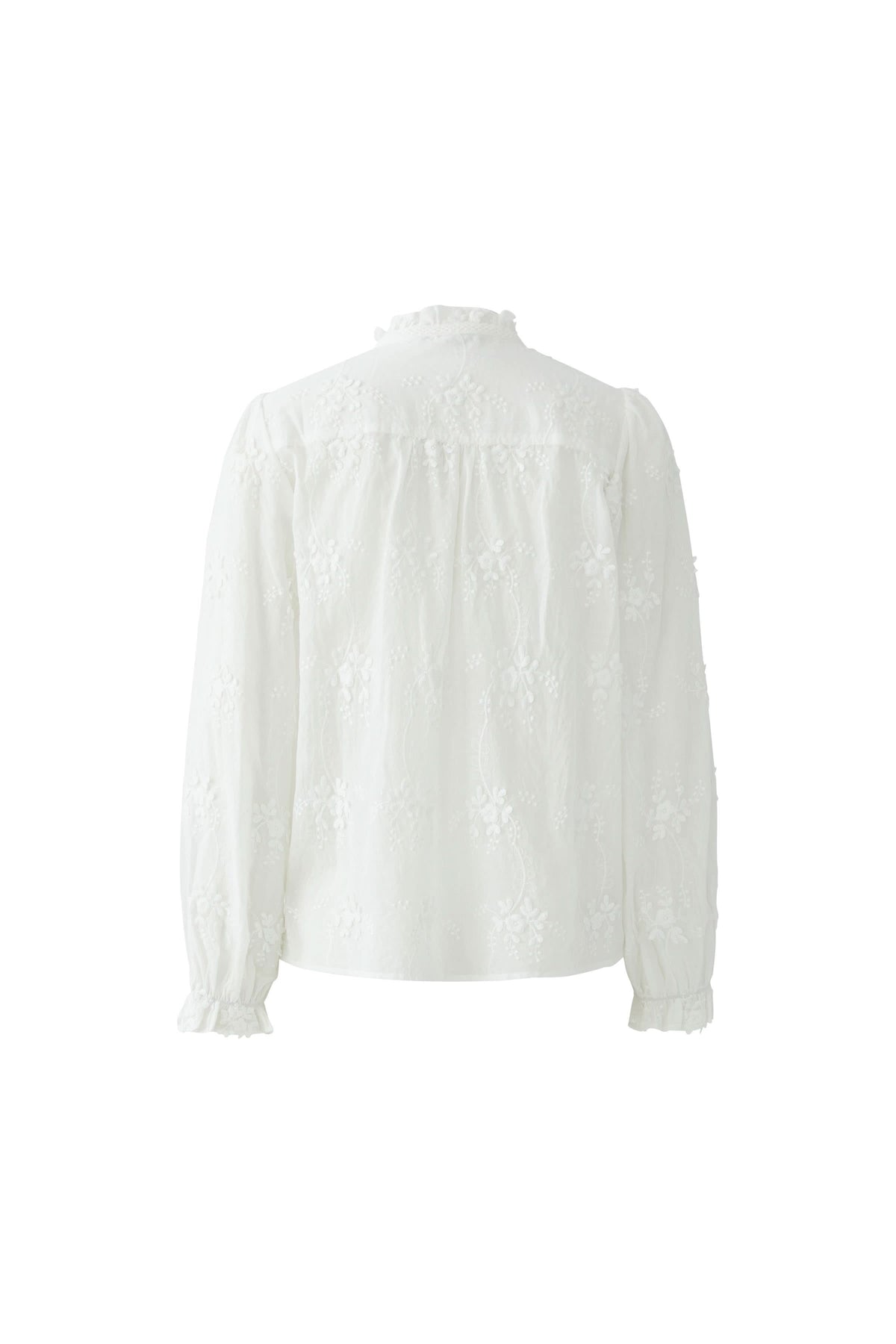 This delicate blouse charms with its refined floral embroidery and feminine look. Its flowing fabric and slightly gathered stand-up collar add an elegant touch, while the subtle front placket lends lightness to the silhouette. Easy to wear every day or for a more formal occasion, it fits naturally into a sophisticated wardrobe.