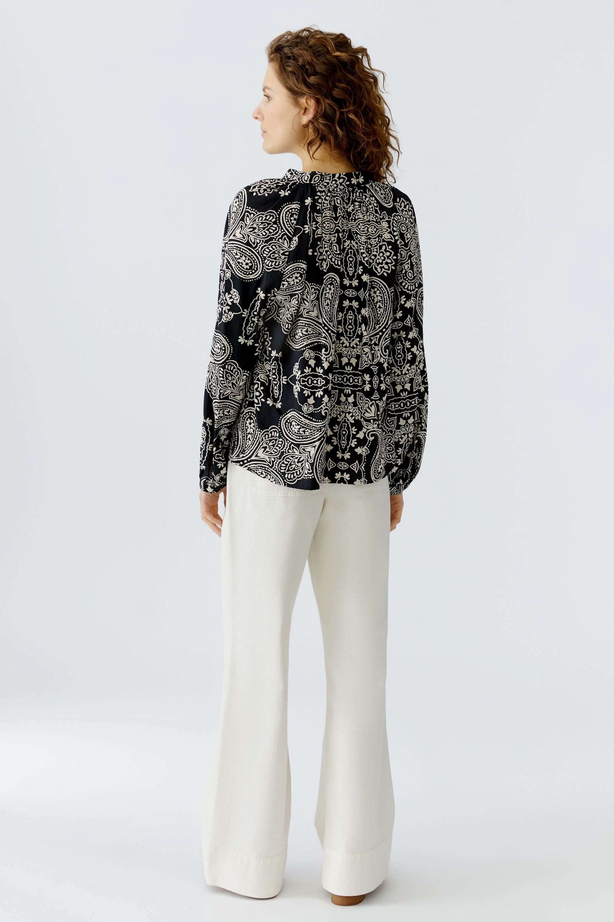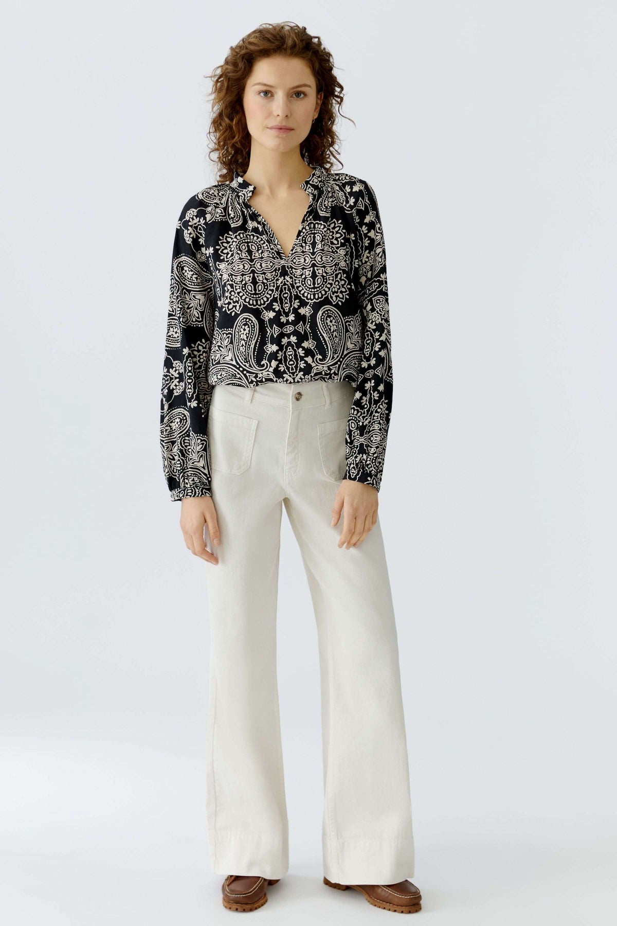 This flowing blouse stands out with its bohemian-inspired graphic print and elegant silhouette. Its straight cut and slightly open neckline give it a feminine, relaxed look that's perfect for everyday wear. Easy to style, it can be tucked into pants or worn loose for a natural, polished look.
