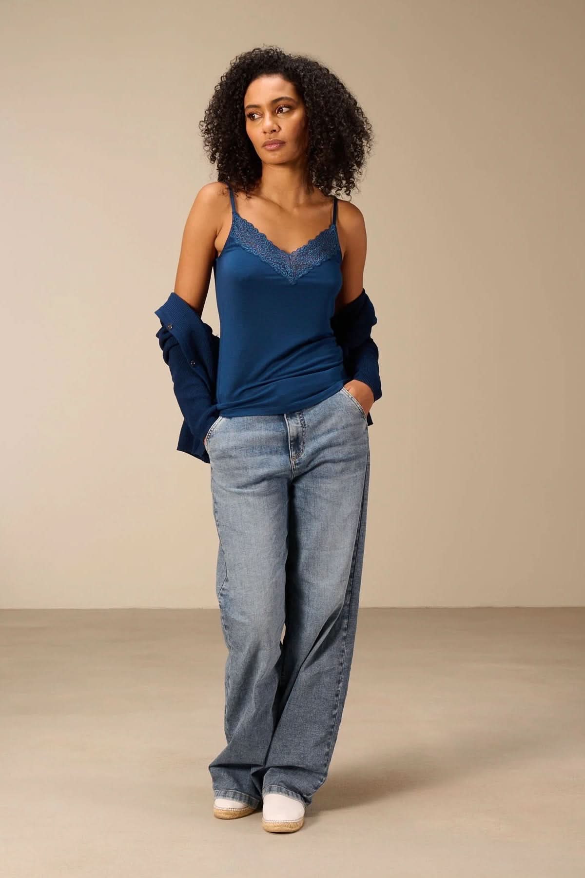 This delicate camisole combines femininity and comfort in a sleek silhouette that's easy to layer. Its V-neckline trimmed with fine lace adds a touch of sophistication, while its soft fabric naturally hugs the body's curves. Worn alone or under a blazer, cardigan, or open shirt, it's the perfect addition to a versatile wardrobe.