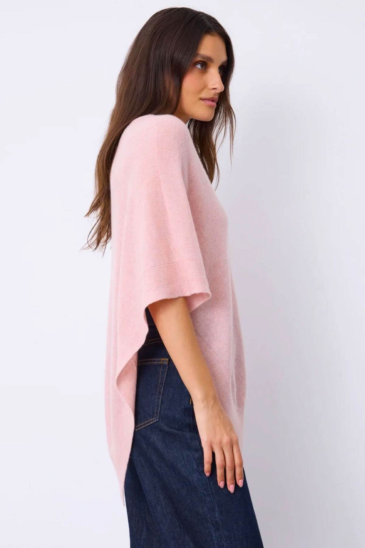 This knit cape offers a flowing, enveloping silhouette, ideal for adding an elegant, casual touch to any outfit. Its generous fit and asymmetrical shape create a natural, refined drape, perfect for layering. Versatile and comfortable, it can be worn both indoors and outdoors on cooler days.