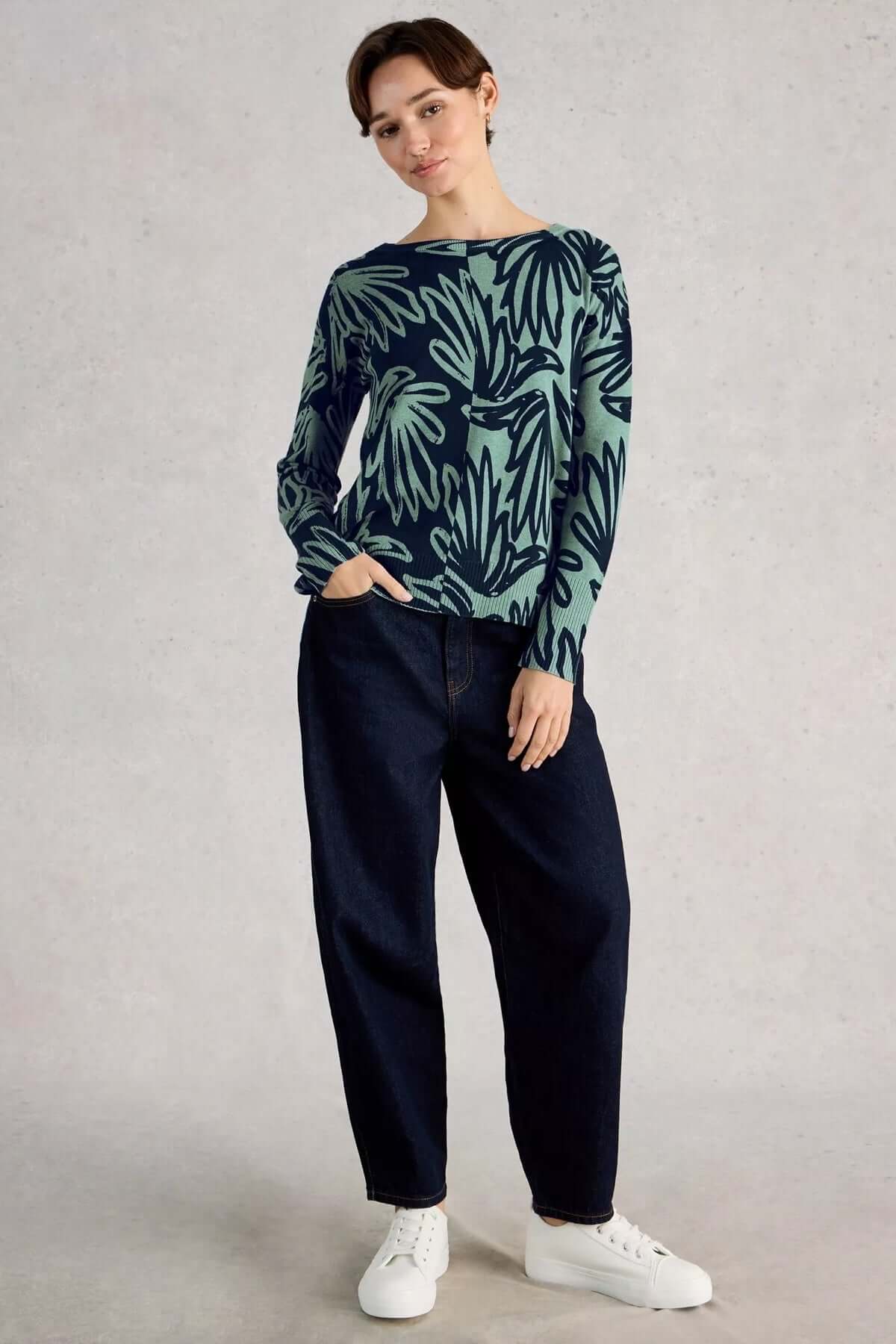 Femme portant un chandail imprimé à manches longues Olive avec un design floral blanc, associé à un pantalon ample et des baskets blanches.