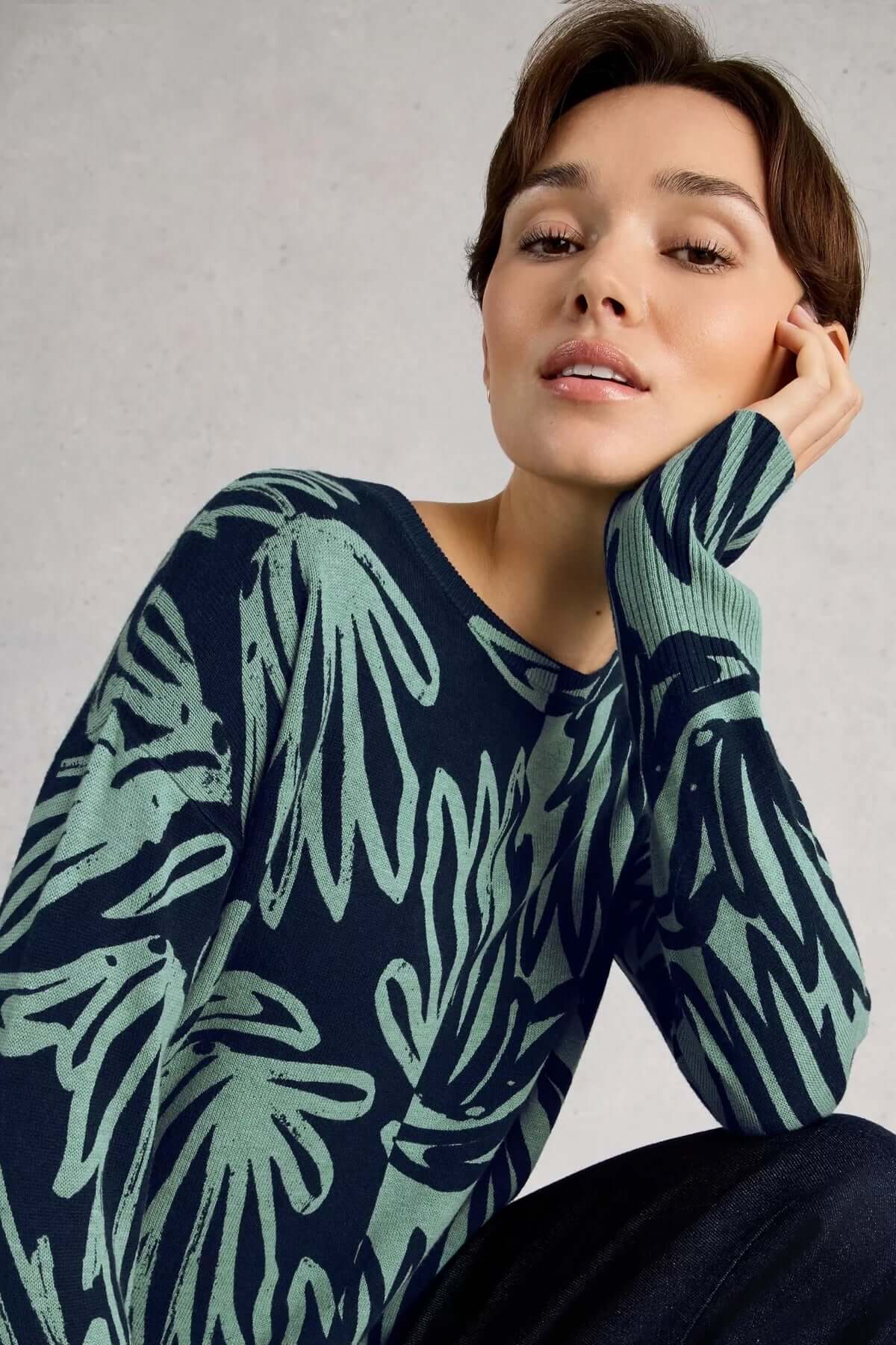 Chandail imprimé à manches longues Olive en maille douce avec imprimé graphique et coupe droite, idéal pour un style décontracté.
