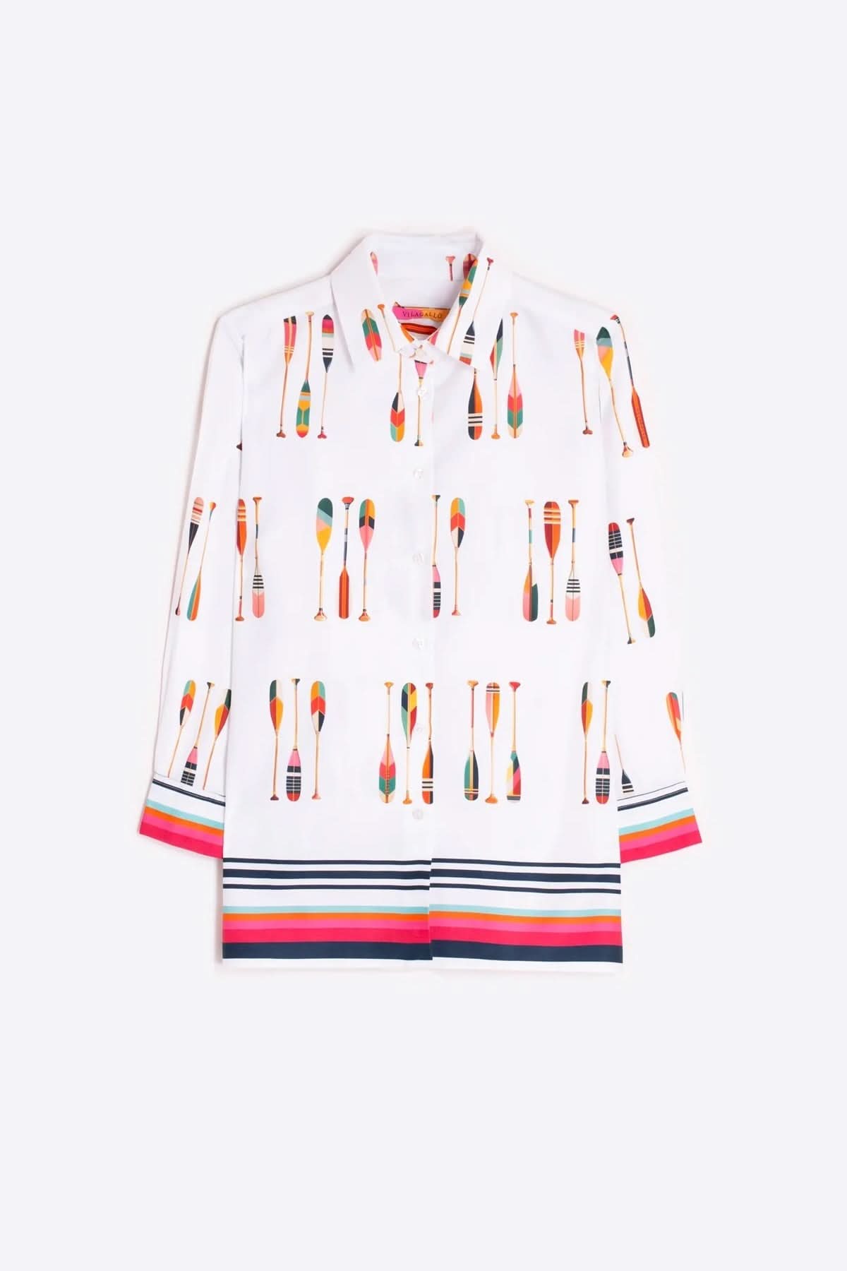 This long blouse stands out with its vibrant graphic print and flowing silhouette. Its classic shirt collar and button closure add elegant structure to the overall look. Contrasting bands at the bottom and cuffs add a dynamic touch that modernizes the piece.