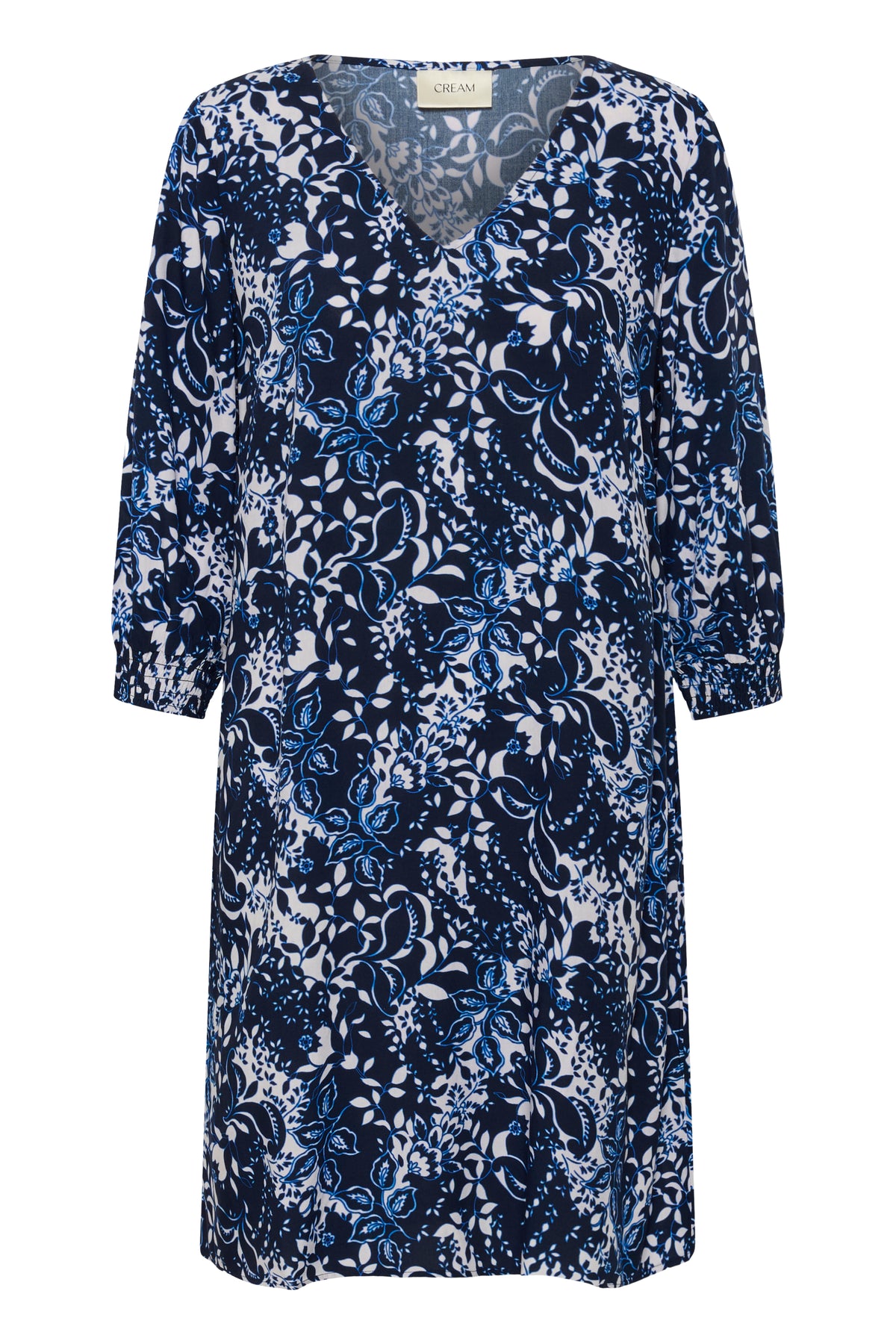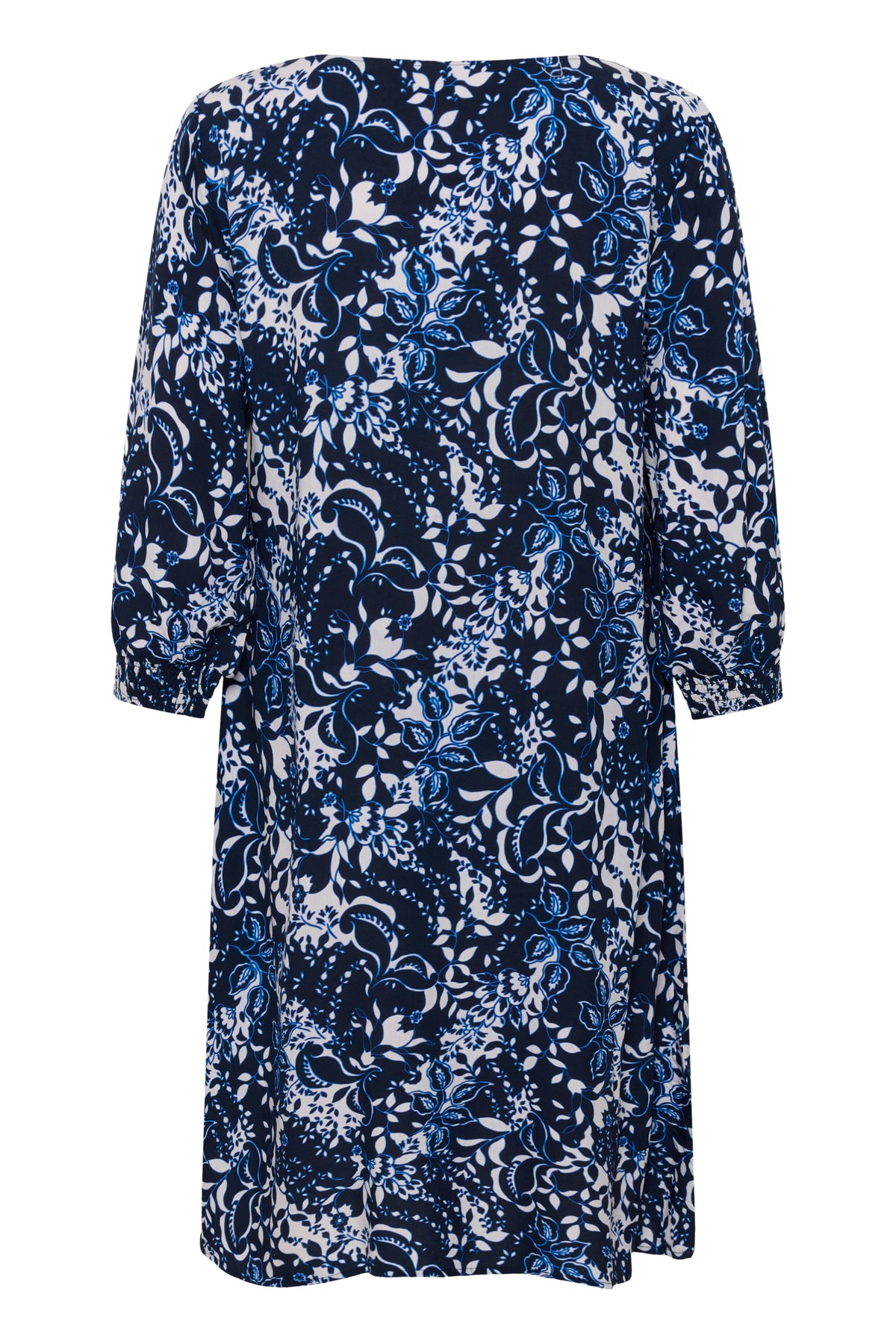 Robe Tiah à motif floral bleu avec encolure en V et manches trois-quarts, élégante et confortable au tombé fluide.