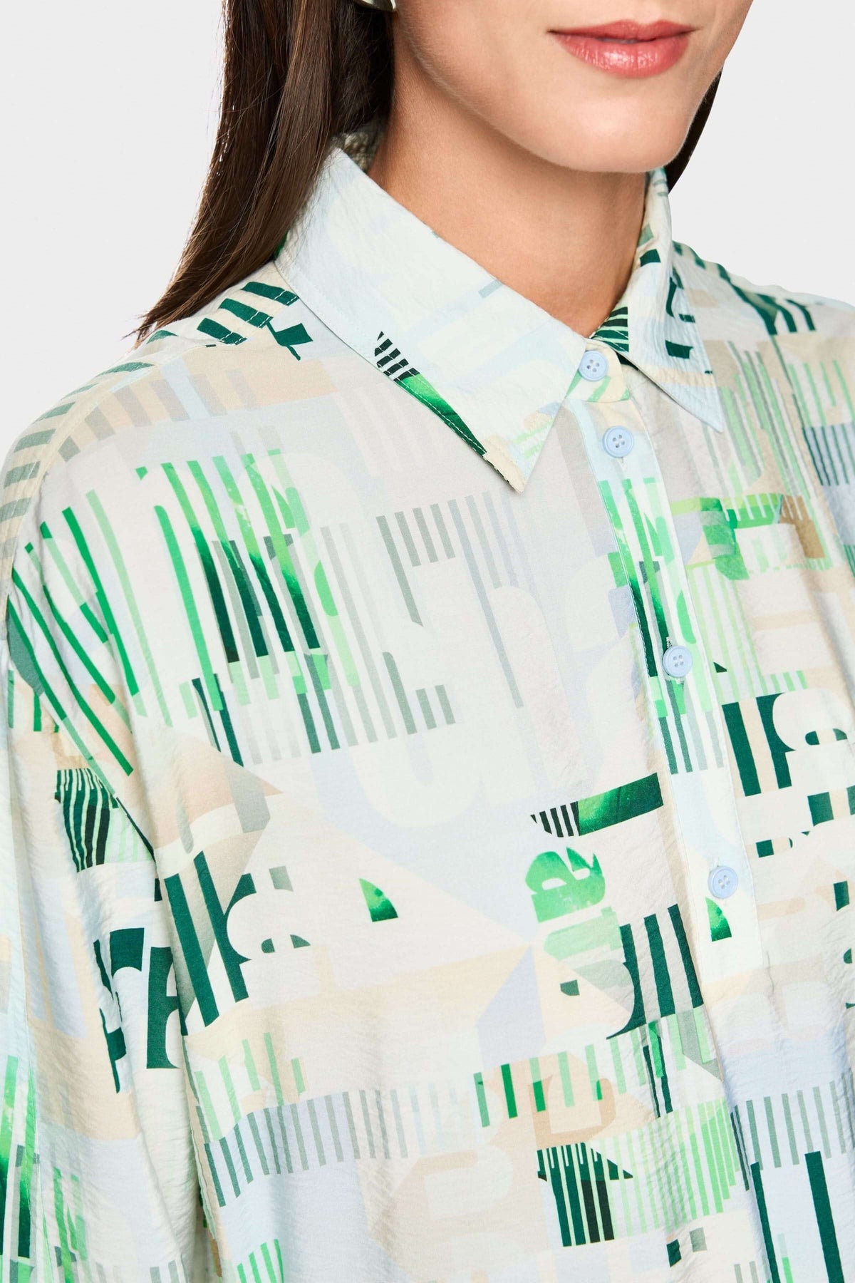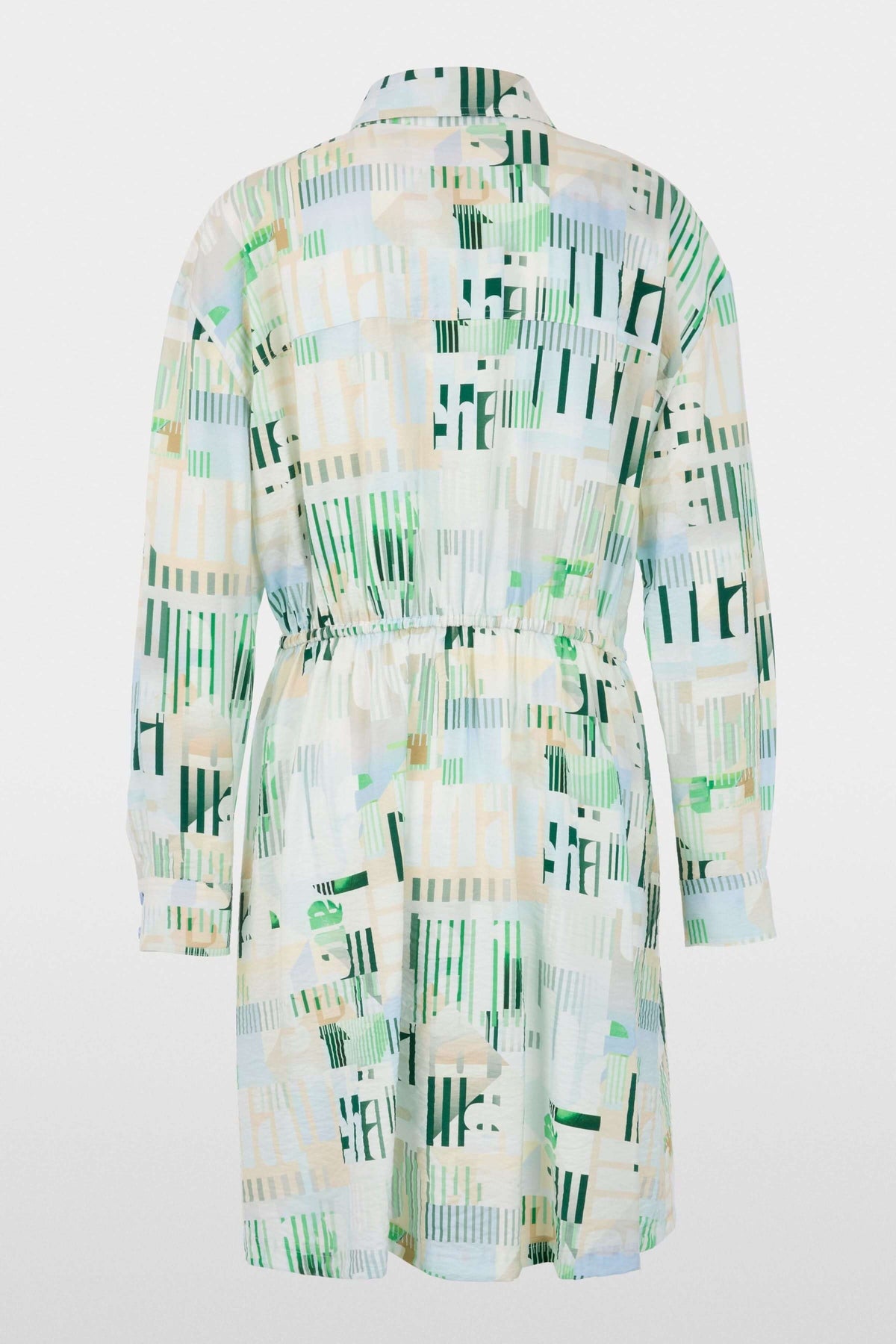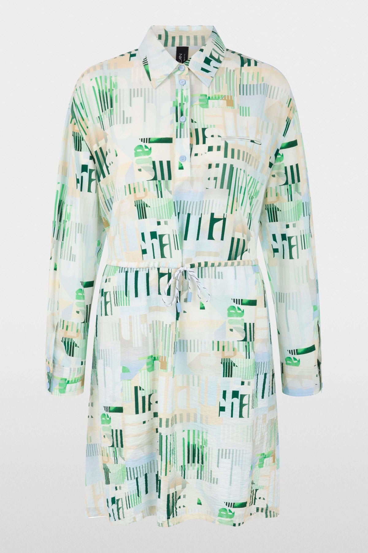 This shirt dress stands out with its modern graphic print and structured silhouette. Its classic collar and button placket add a polished touch, while the drawstring at the waist allows you to adjust the fit to your liking. Lightweight and comfortable, it can be worn with sandals or sneakers for a contemporary and versatile look.