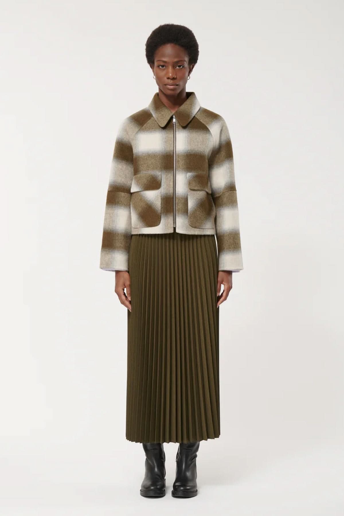 Femme portant une veste courte à carreaux avec poches à rabat et fermeture éclair, associée à une jupe plissée et des bottes noires.