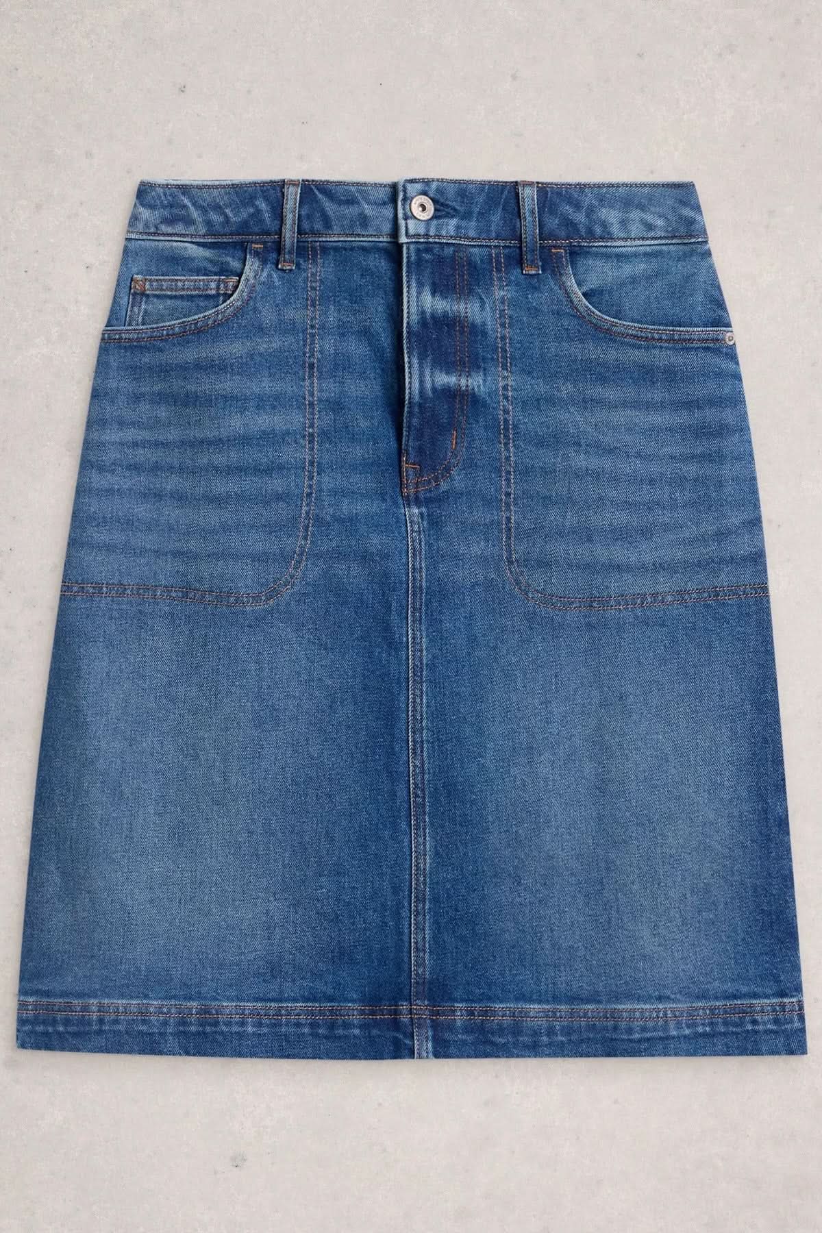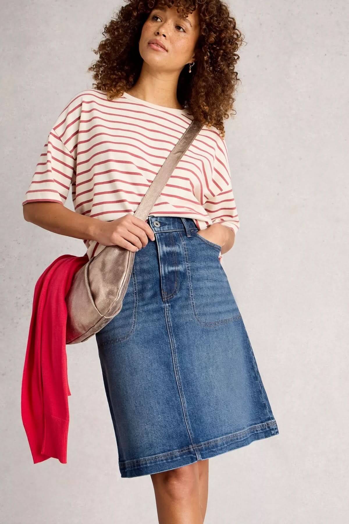 Description: This classic denim skirt revisits a wardrobe staple with its straight fit and flattering high waist. Its versatile style makes it easy to pair with a casual T-shirt or a dressy blouse. Style tip: Wear it with a light sweater and sneakers for a casual chic look.