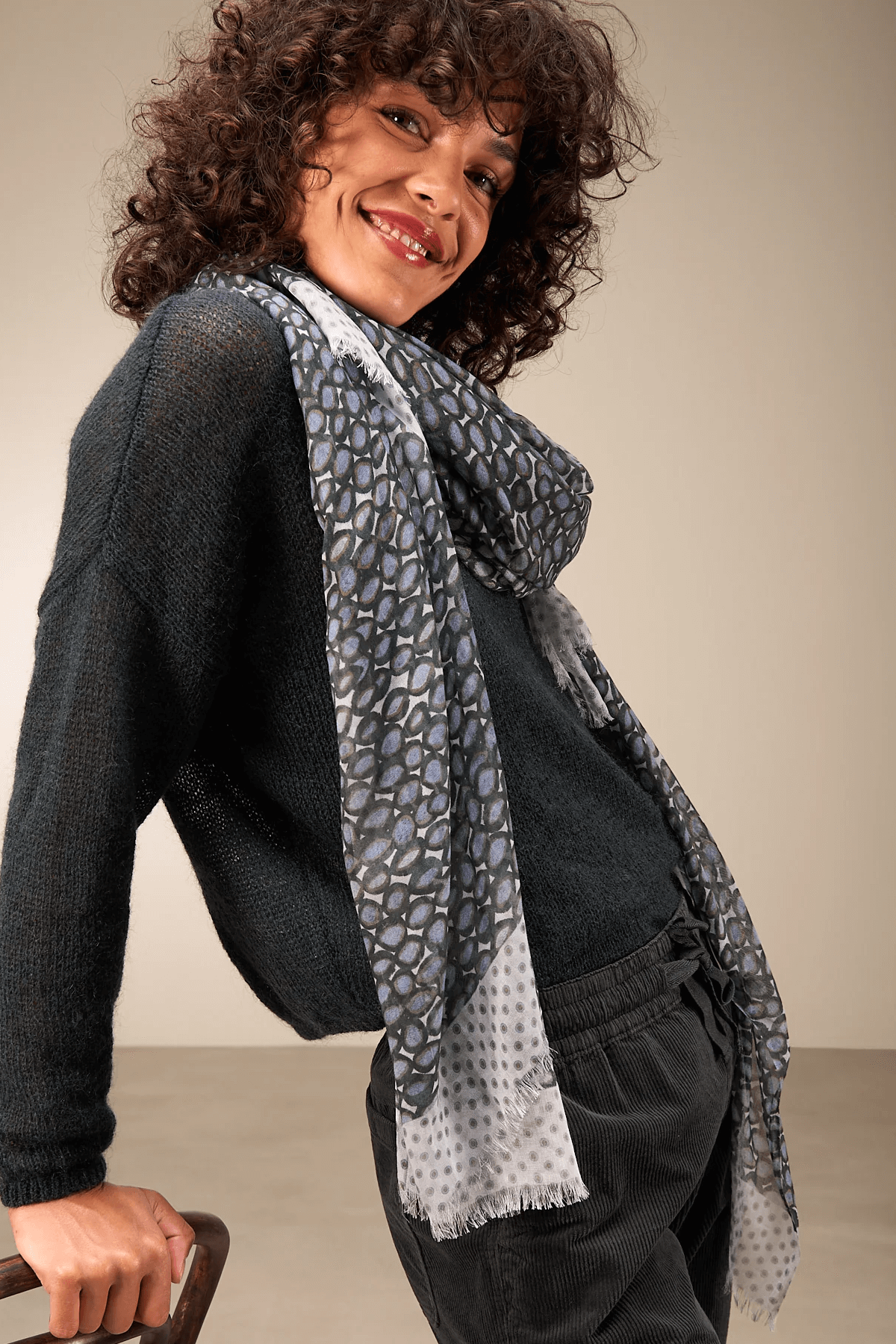 Description: This lightweight, flowing scarf adds a sophisticated touch to your outfits, whether you wear it around your neck or as a stylish accessory. Its soft texture ensures comfort throughout the day. Style tip: pair it with a plain sweater to highlight its refined design.