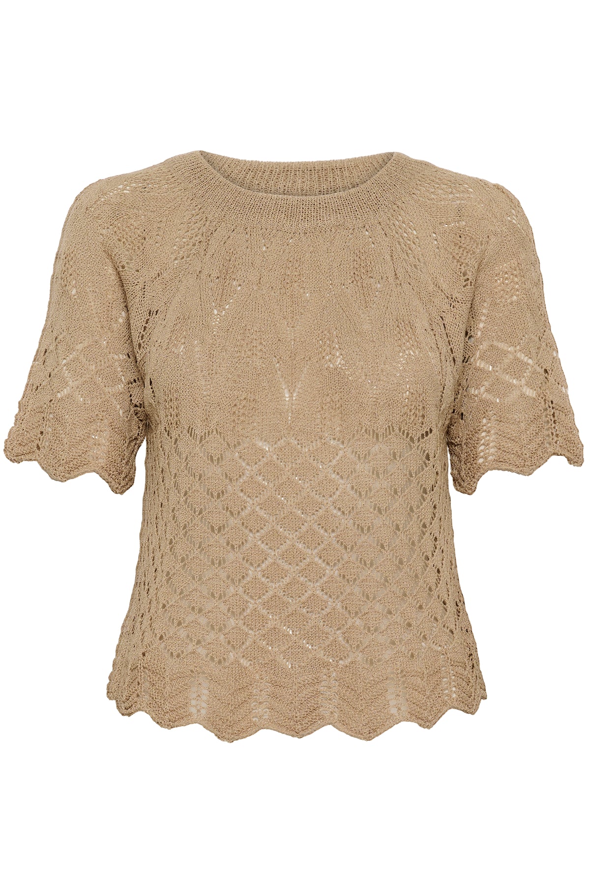 This openwork knit T-shirt charms with its delicate pattern and feminine look. Its intricate texture creates a subtle play of transparency that brings lightness and refinement to the silhouette. Easy to layer over a camisole, it perfectly complements a flowing skirt or pants for a soft and elegant look.