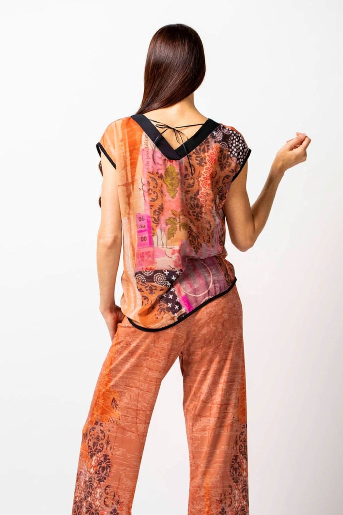 Printed short-sleeved top in lightweight, flowing chiffon. Designed to be worn on both sides, it features a V-neckline on each side, one of which is embellished with drawstrings for a touch of originality. Bias trim adds a refined touch. Ideal for both chic and casual wear, this top offers versatility and elegance.