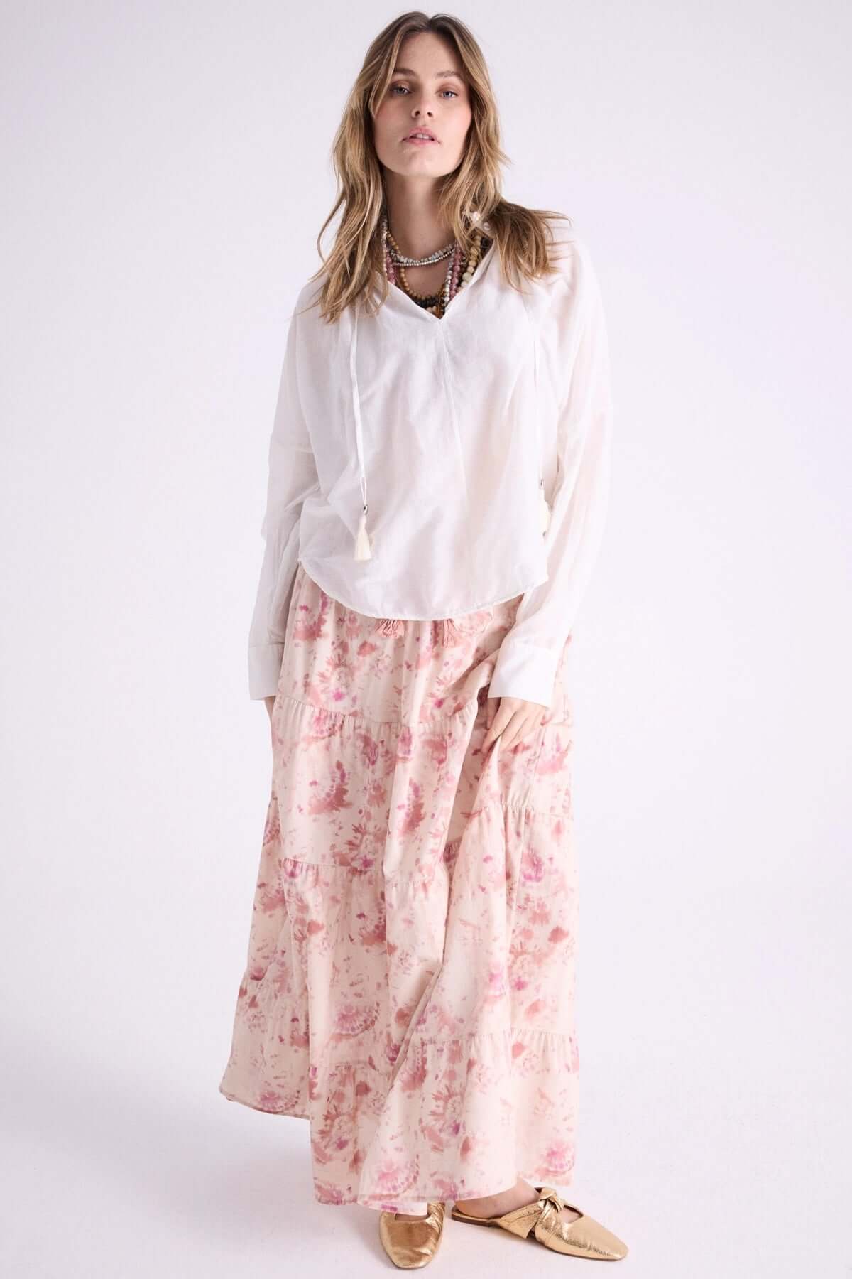 Femme portant une blouse légère à capuche et une jupe longue fleurie, affichant un style bohème et décontracté.