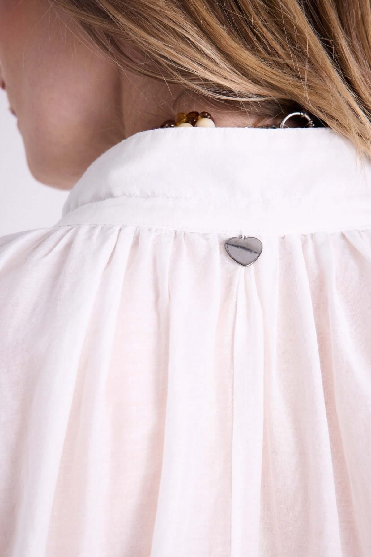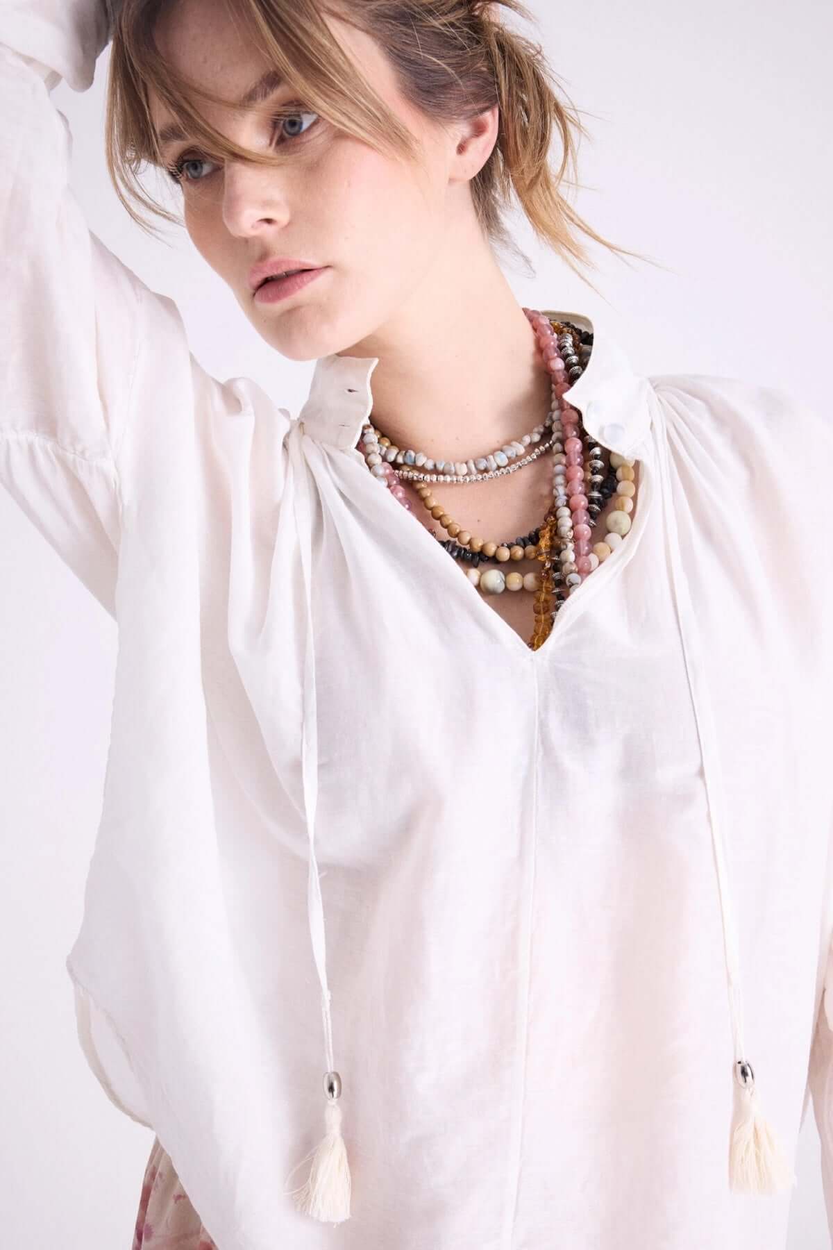 Blouse légère blanche à capuche avec cordons, accessorized avec des colliers colorés, esprit bohème.