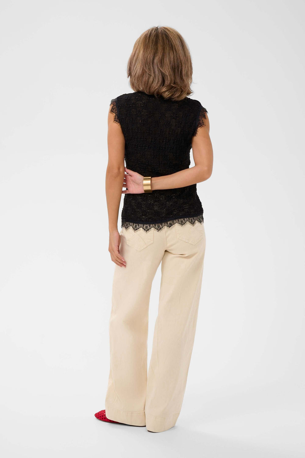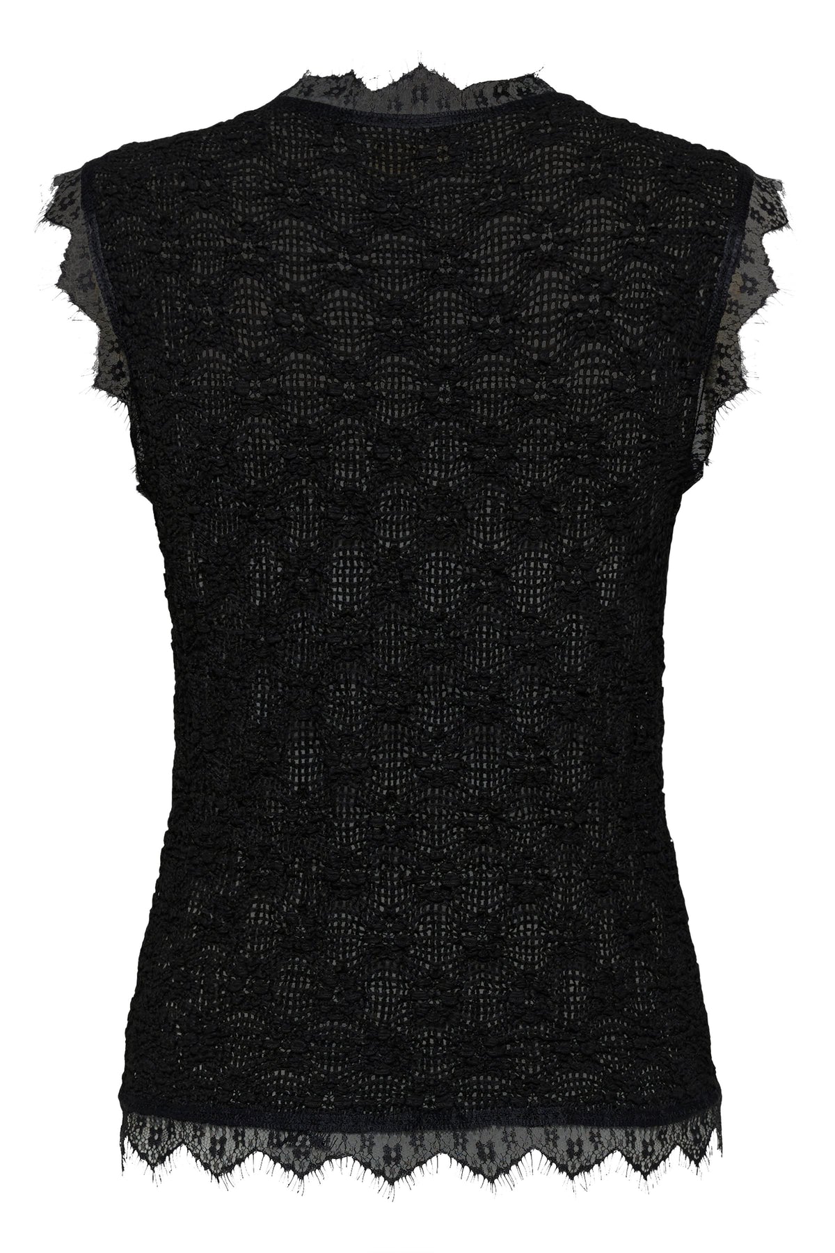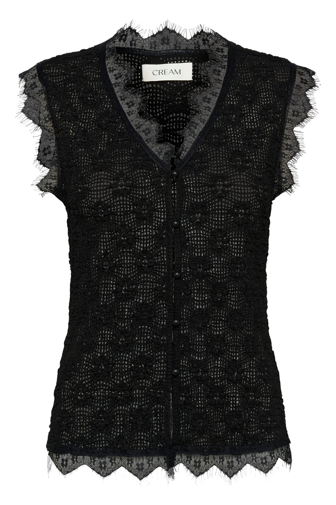 This sleeveless camisole offers an elegant and feminine silhouette, ideal for warmer days. Its delicate lace adds texture and refinement while subtly revealing the skin. The button closure and scalloped edges add a sophisticated touch to this versatile style.