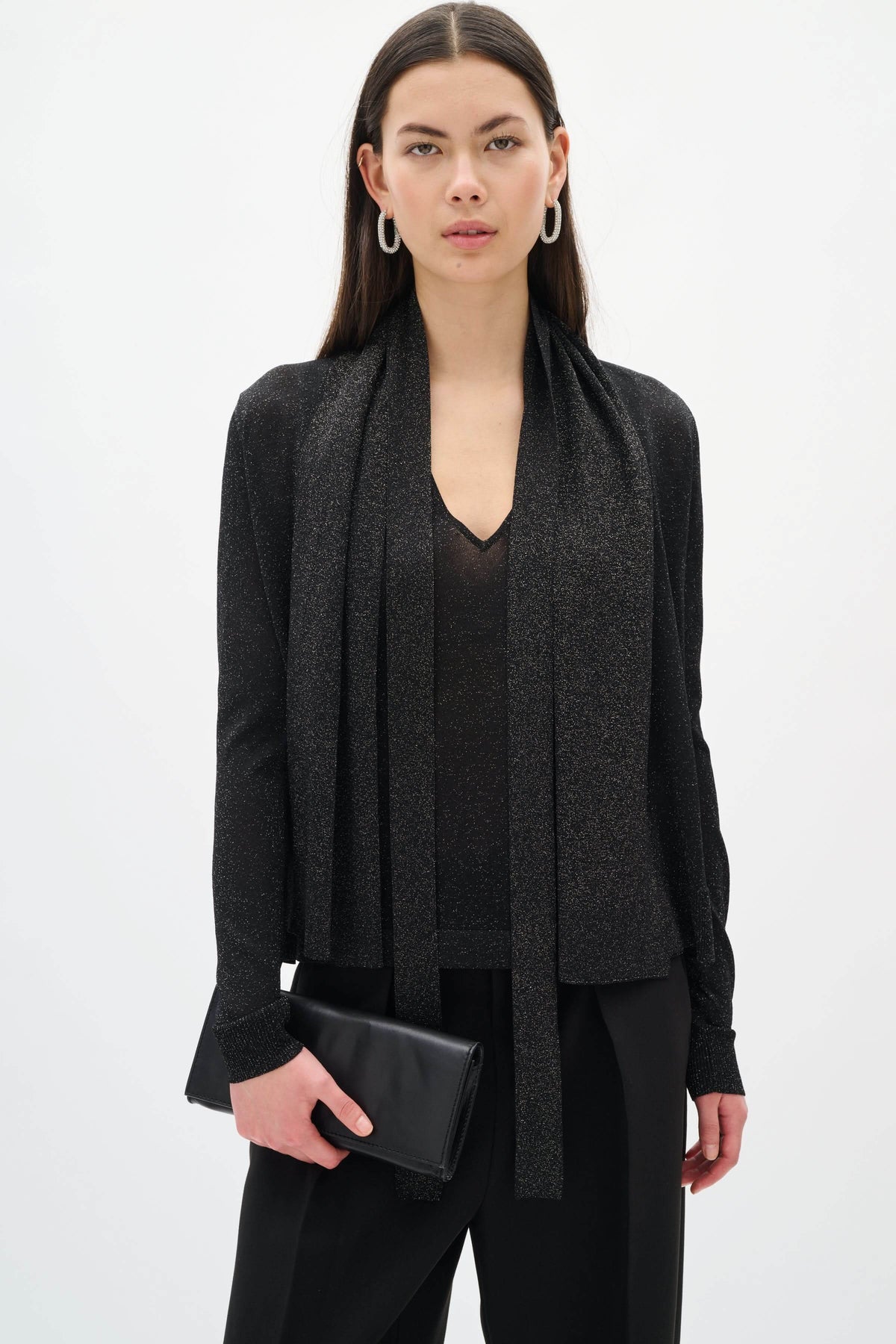 Description: This refined cardigan captivates with its luminous fabric and flowing drape. Featuring a built-in scarf for an extra touch of elegance, it instantly elevates your outfits. Lightweight and comfortable, it is perfect for completing a dressy look or adding a sophisticated note to an evening outfit.