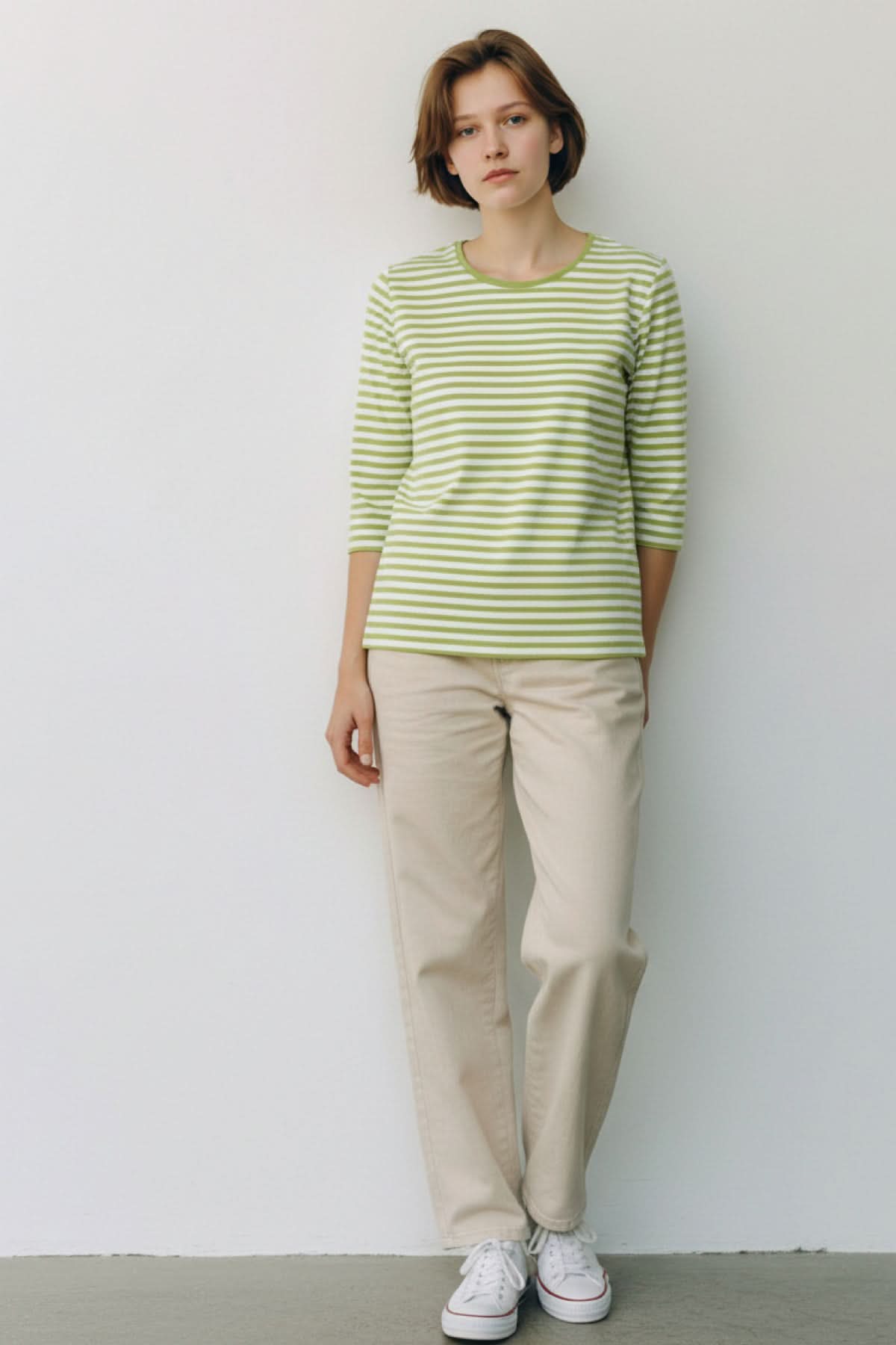 Description: A sleek striped sweater designed for everyday wear. Its straight hem and rounded collar offer a timeless look that's easy to wear on its own or under a jacket. The three-quarter sleeves add a casual and versatile touch.