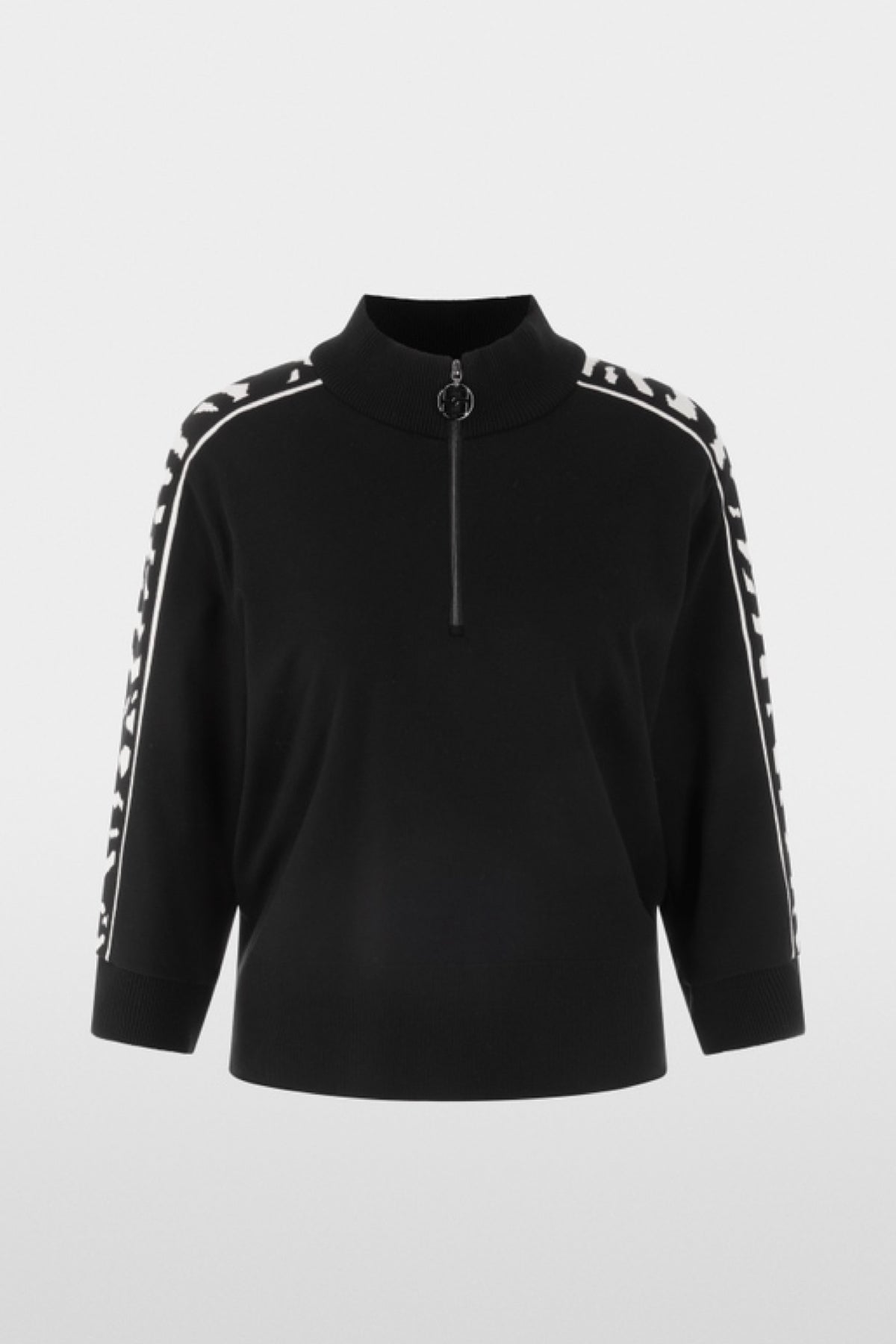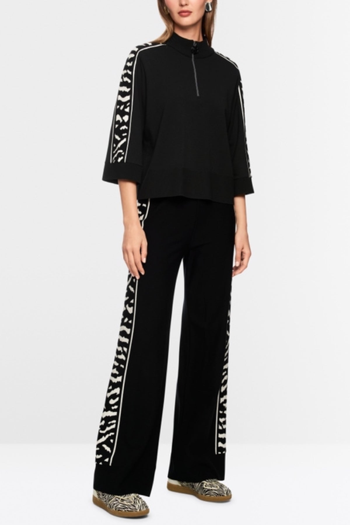 Description: This sweater is appealing thanks to its Fit and wide 3/4 sleeves with a wide contrasting animal print band adorning the sleeve. The collar and hem feature wide ribbed edges. A zipper at the front of the collar allows the sweater to be worn open. This model is responsibly manufactured and bears the "Rethink Together" sustainability label.